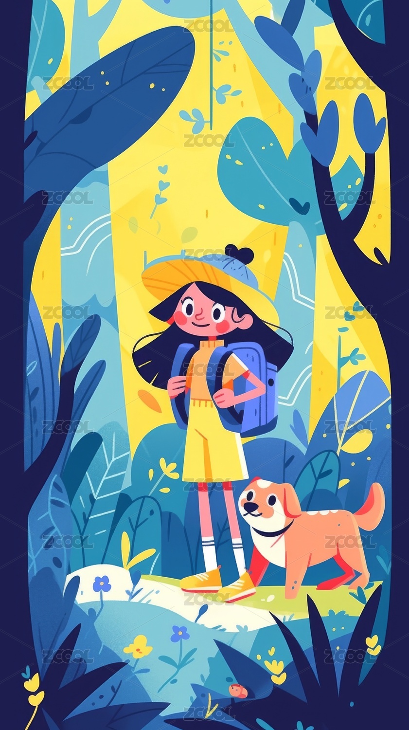 平面插画走在森林中的女孩