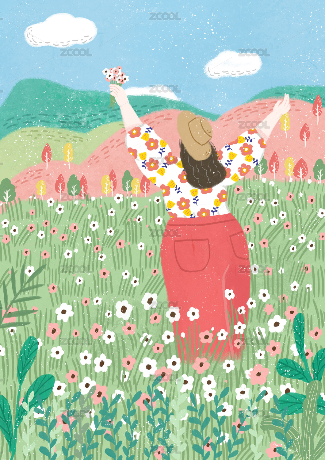 站在一大片花海中手拿花束开双臂的女孩插画