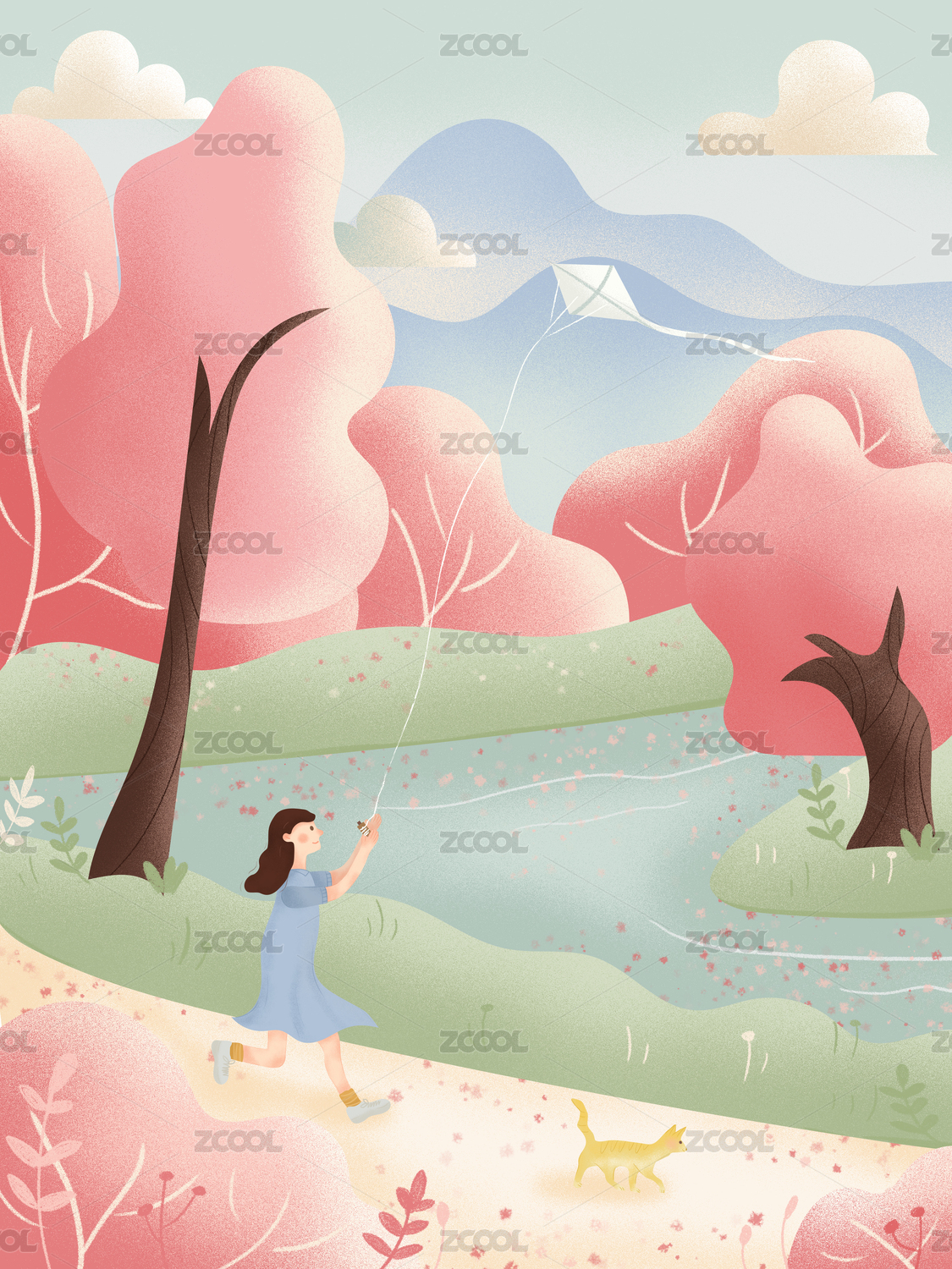 春天和猫咪一起在河边放风筝