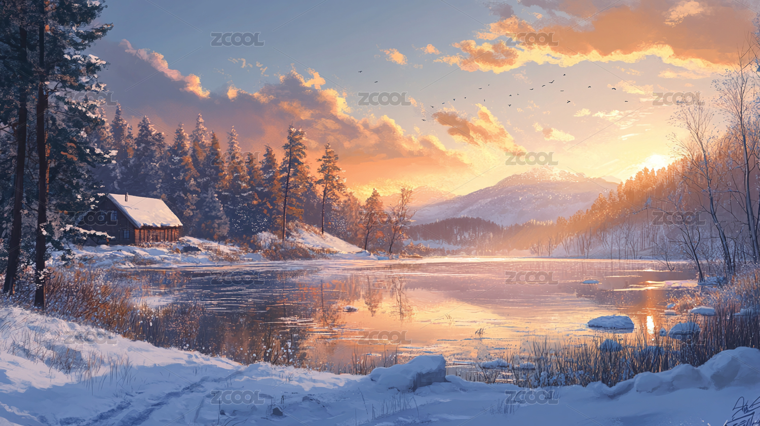 湖边被雪覆盖的小屋和雪中绿草,初春,插画