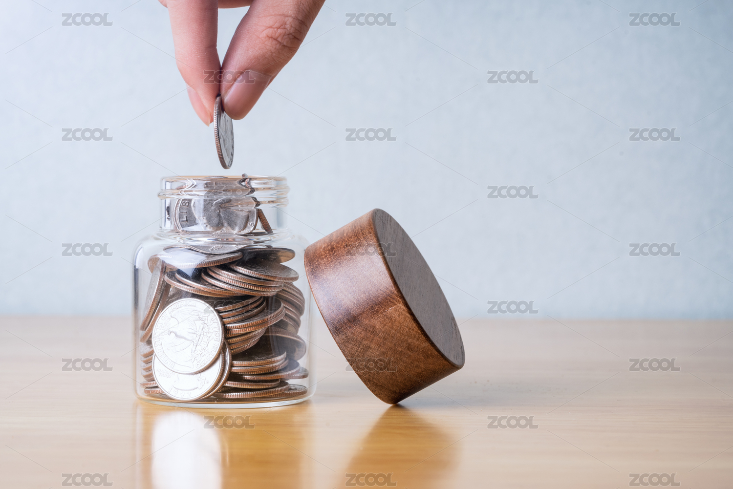 虚化绿植背景前的桌子上放着一个满装美元硬币的玻璃瓶