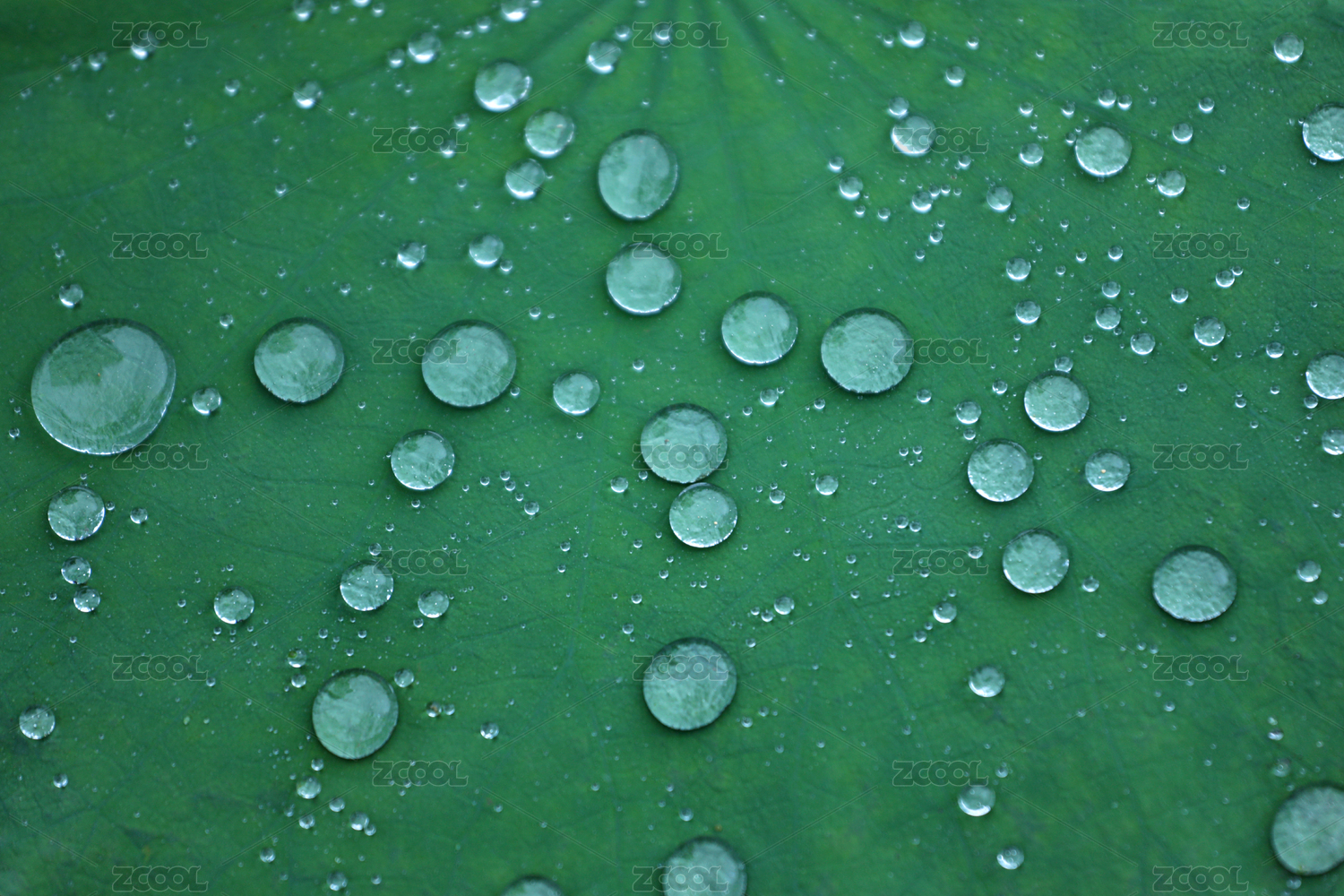 夏天绿色荷叶和上面的雨滴水珠水滴的特写