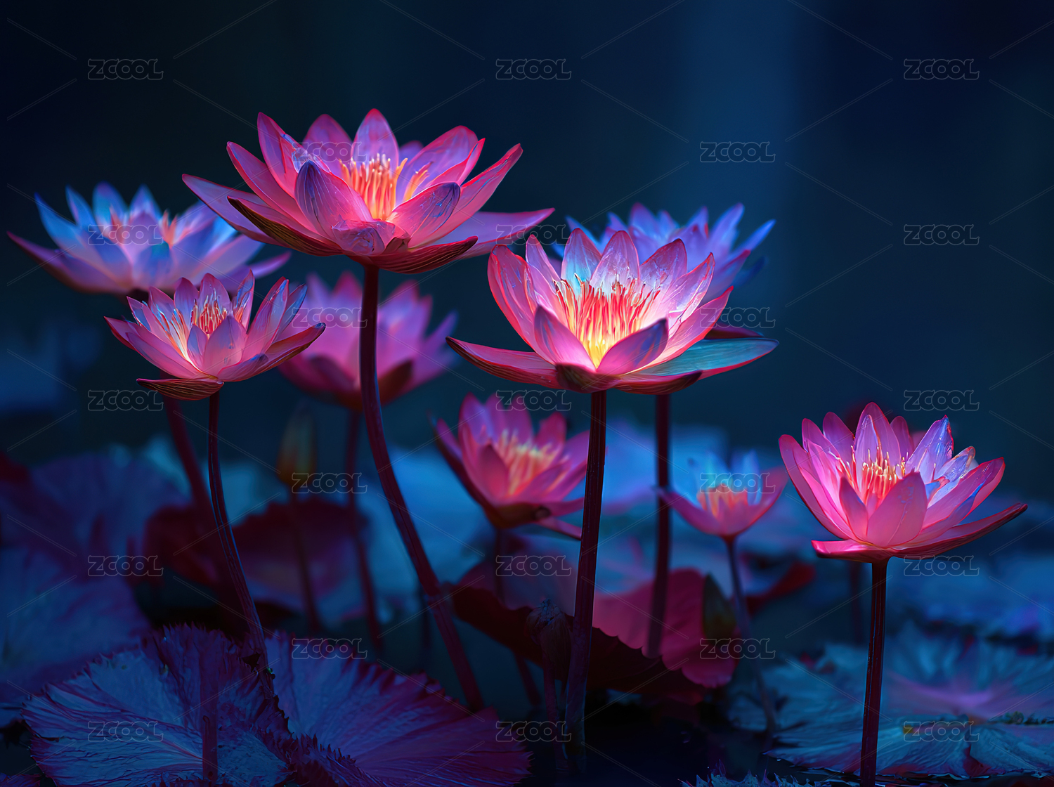 魔法发光睡莲在水塘中美丽盛开的特写插图