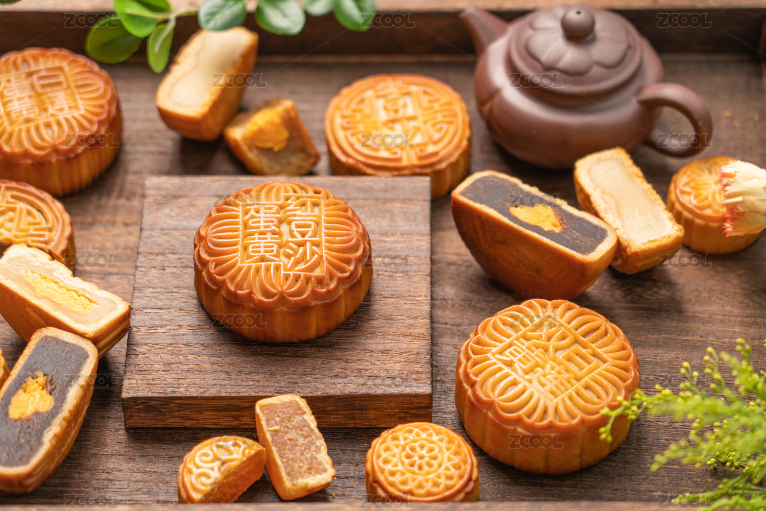 植物和兔子装饰下的中秋节美食月饼