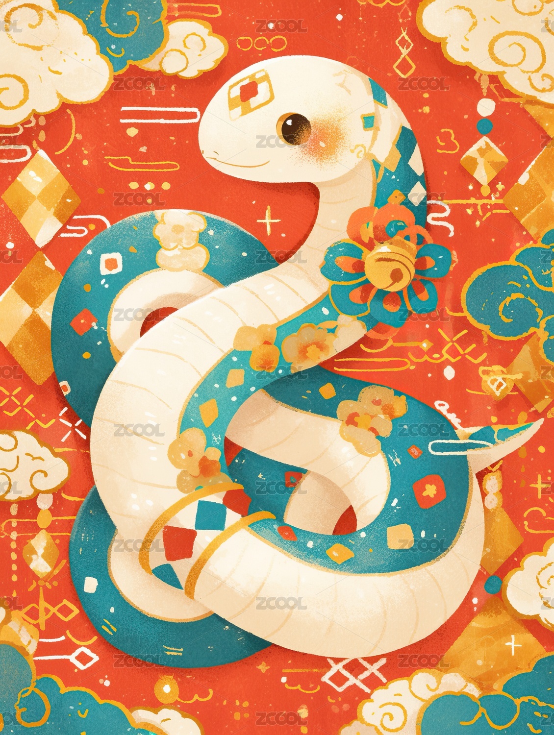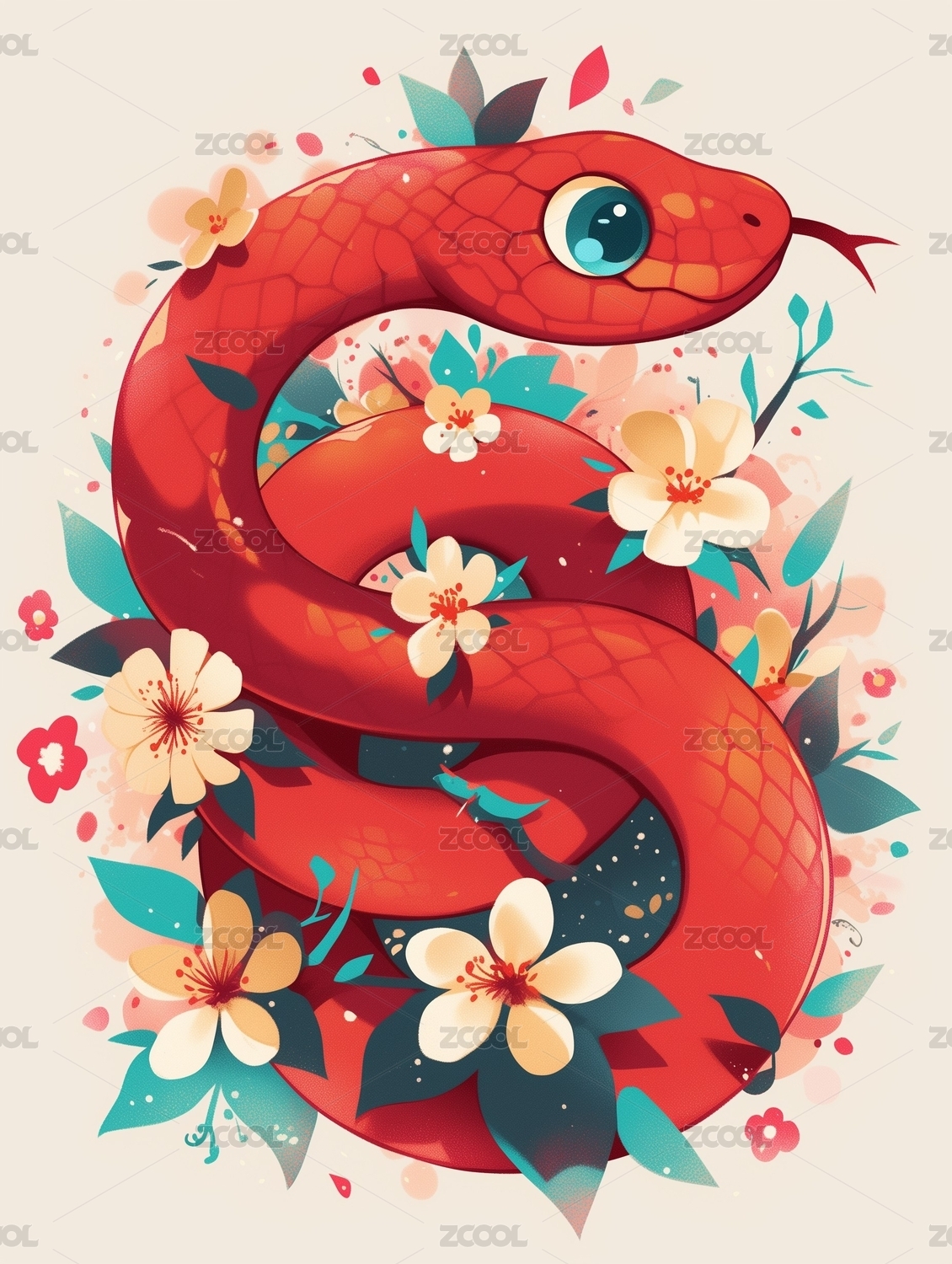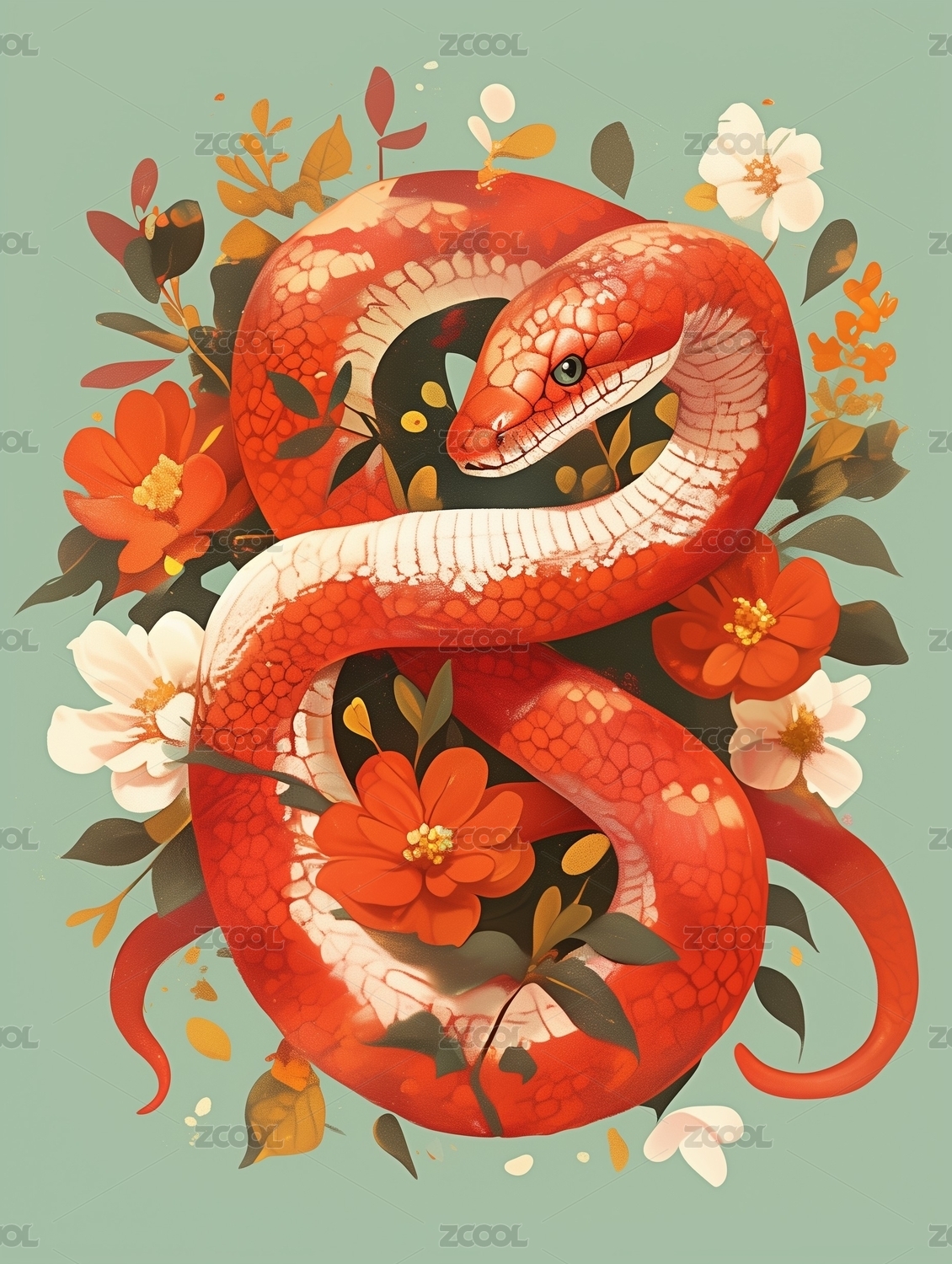喜庆的复古风格五彩斑斓的蛇和花朵