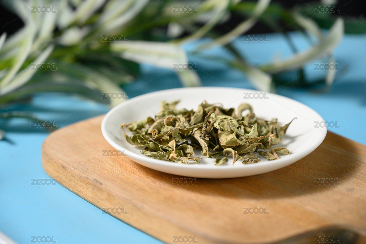 桌面上的盘子里的干爽的佩兰