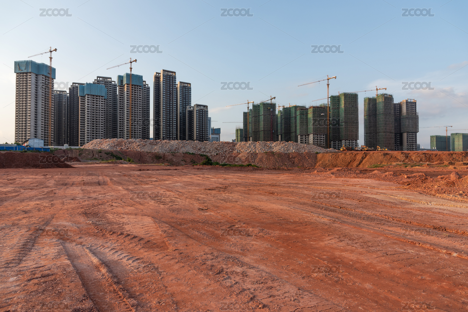 建筑工地上的泥沙地面和远处的建筑
