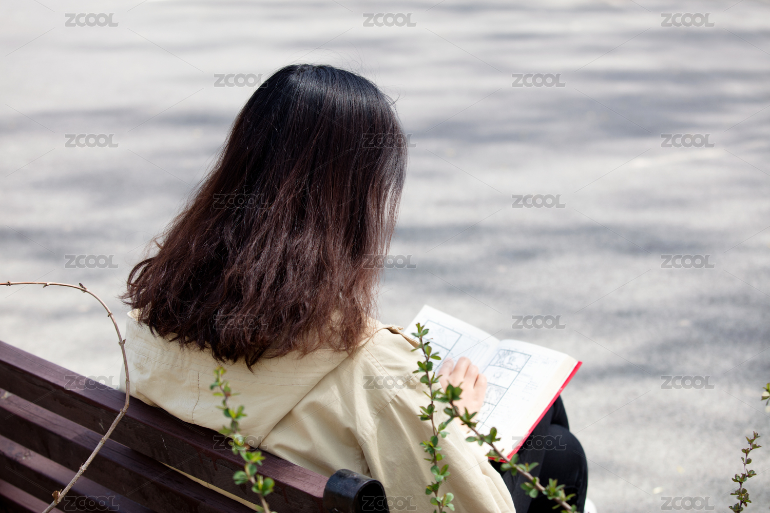 春天公园长凳上看书的女性