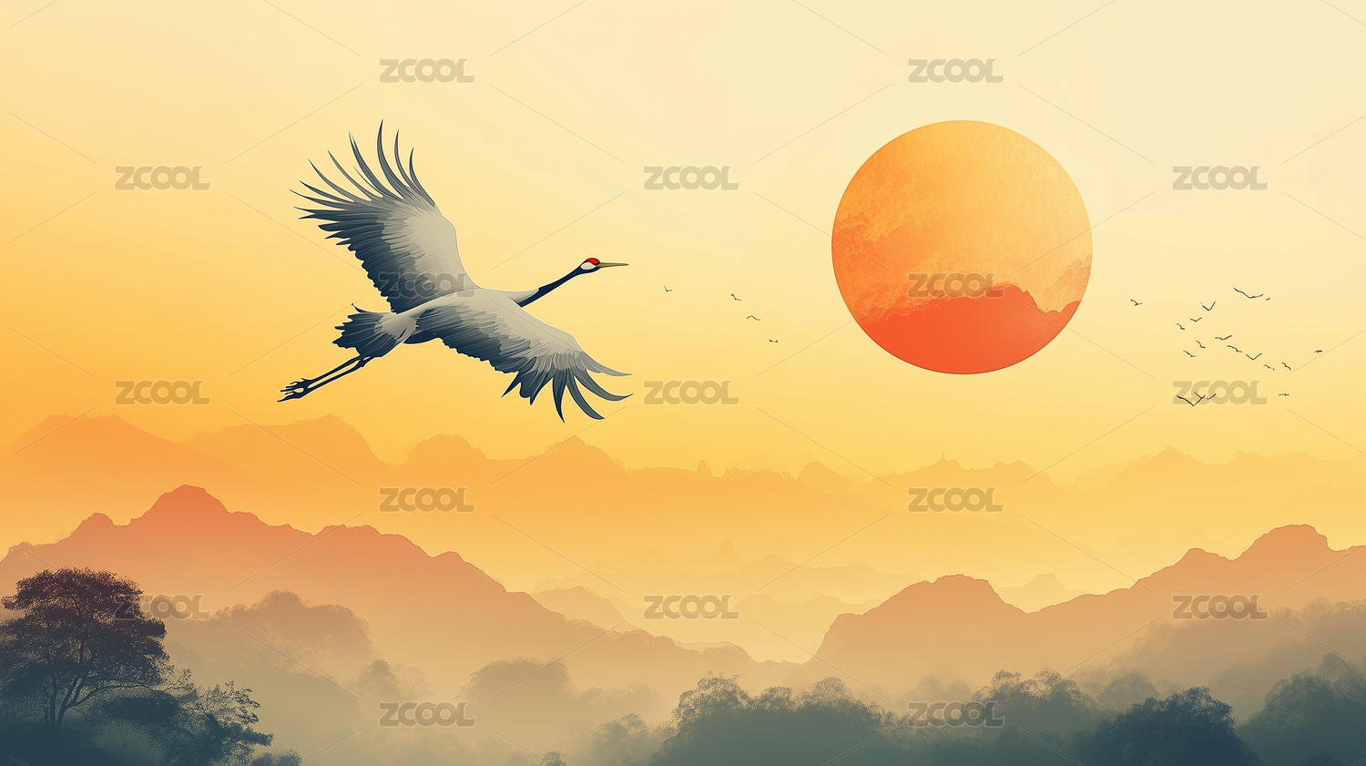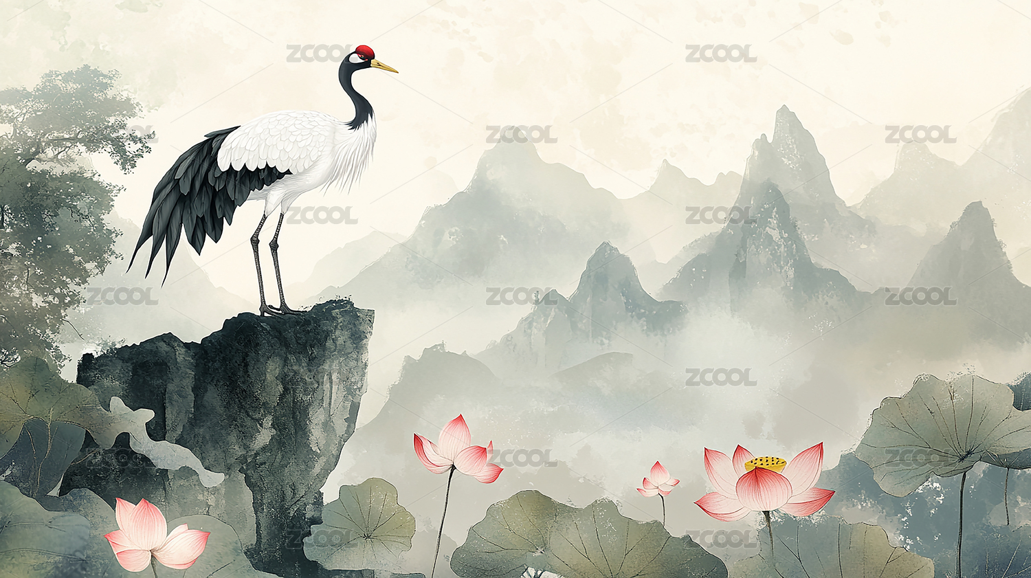 中国风仙鹤云雾山峦意境图