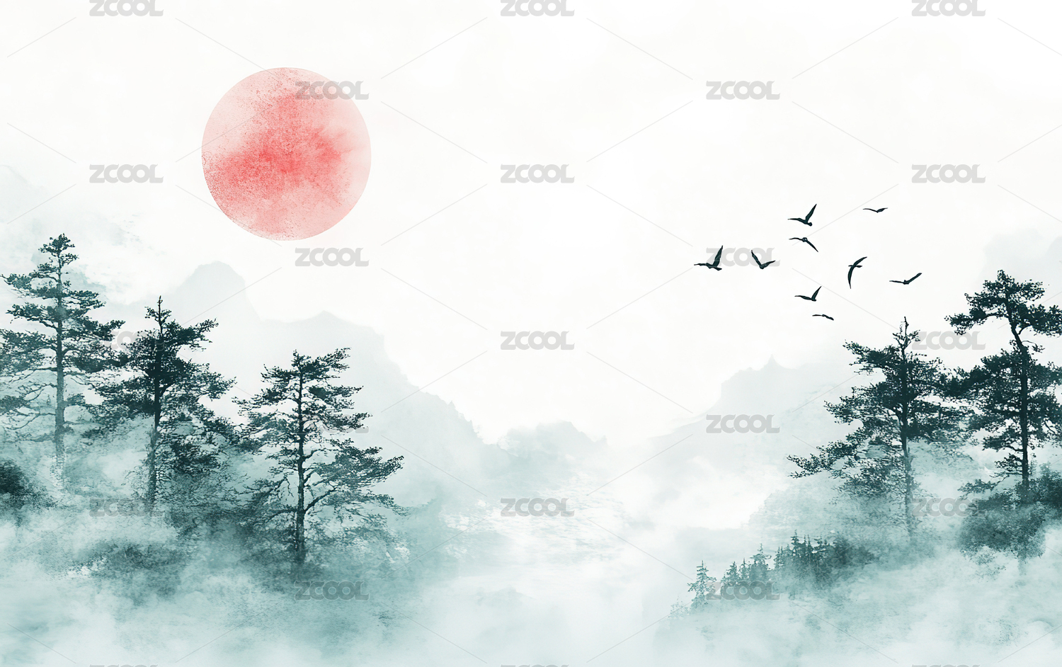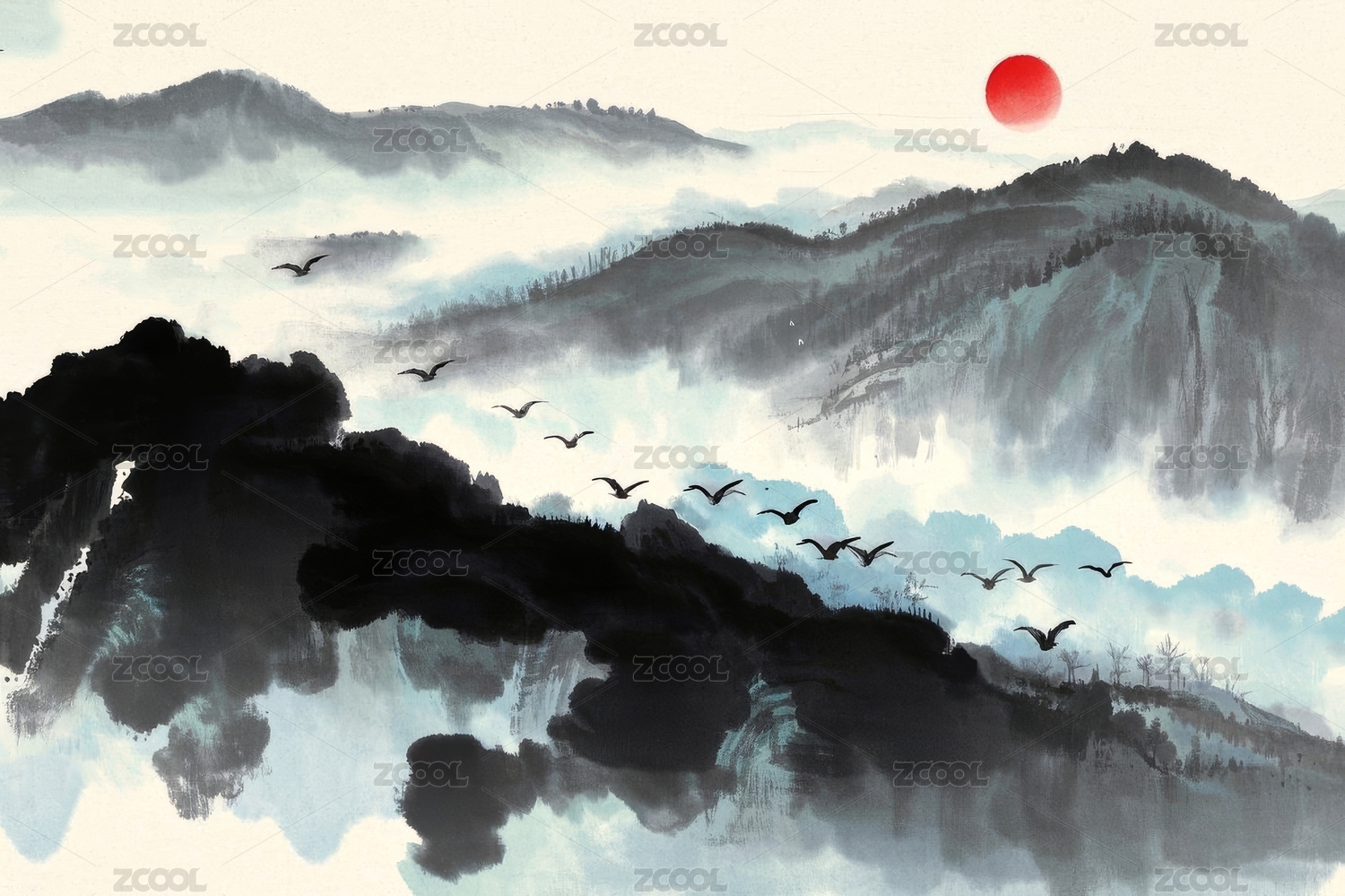 红日水墨山水场景