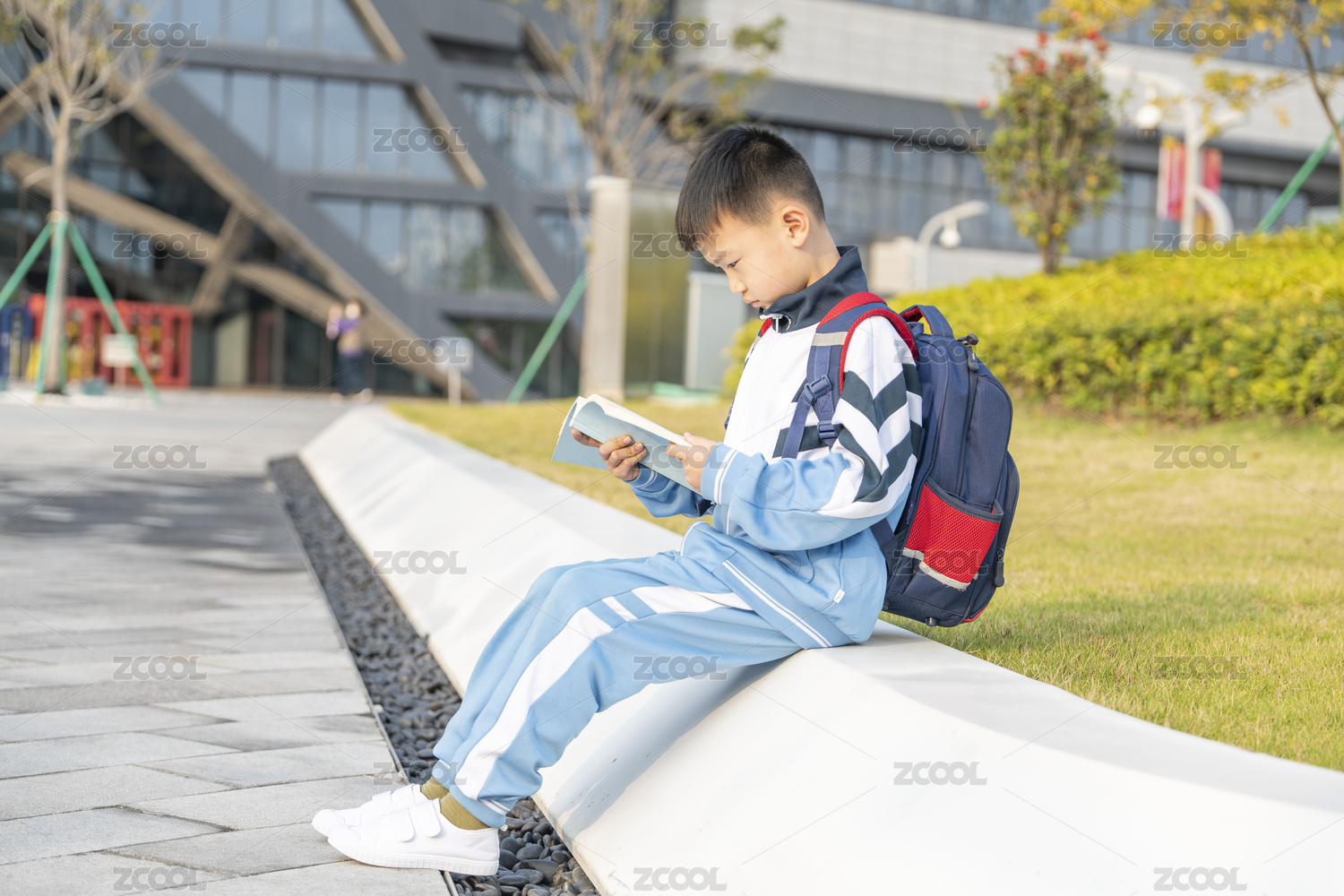 坐草地旁边看书的小学生
