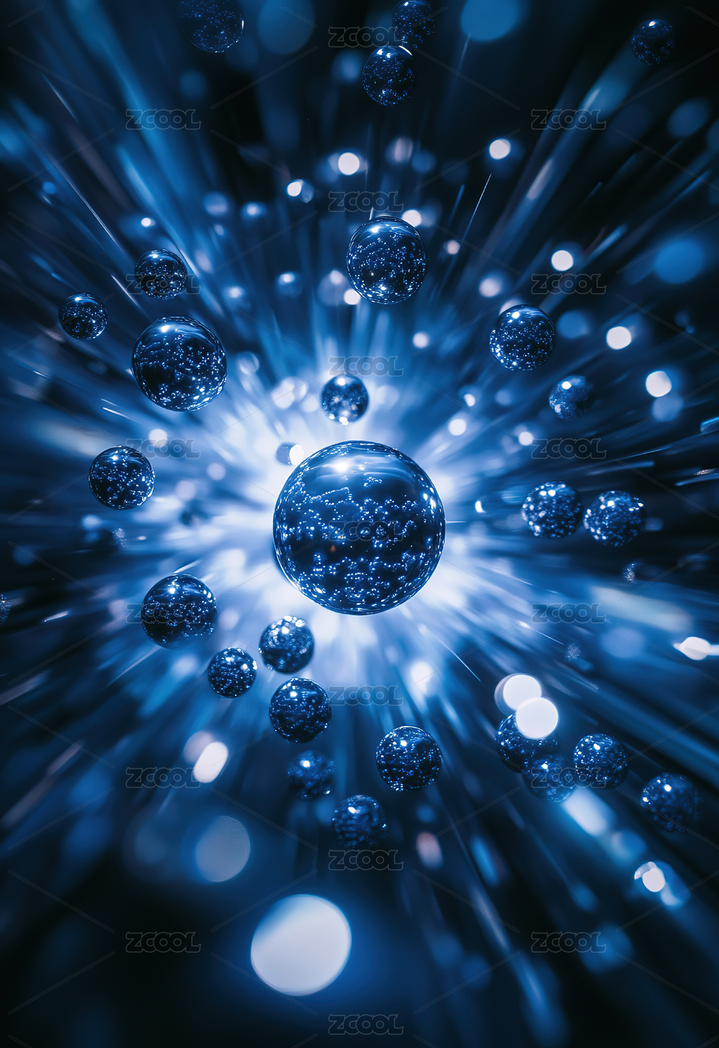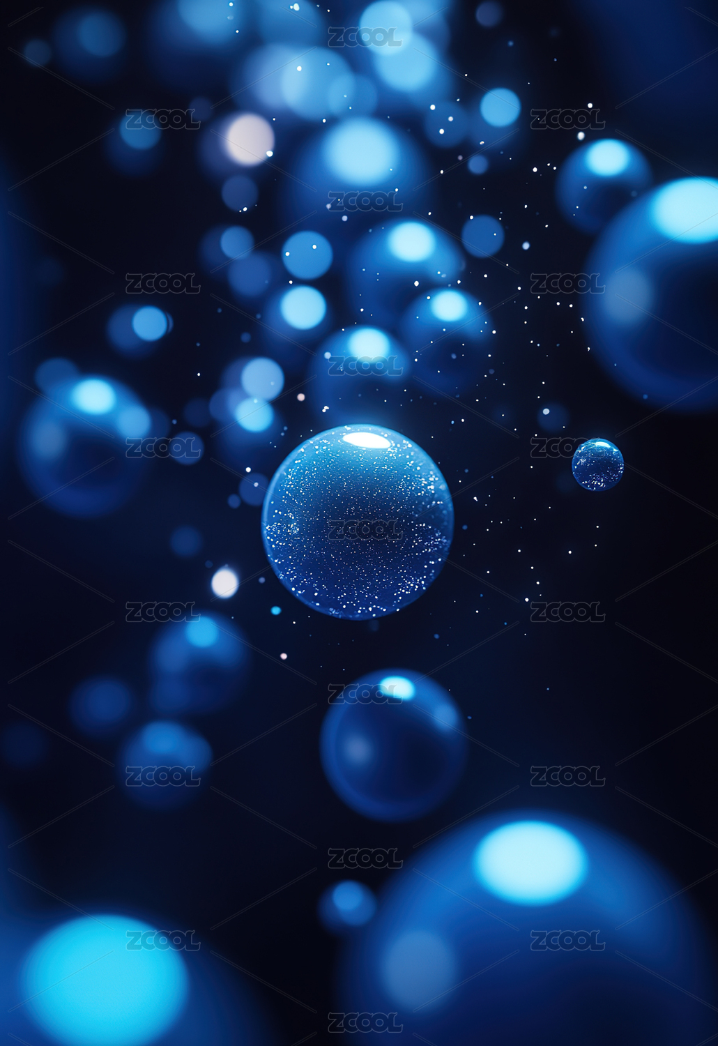 蓝色背景中漂浮的玻璃球