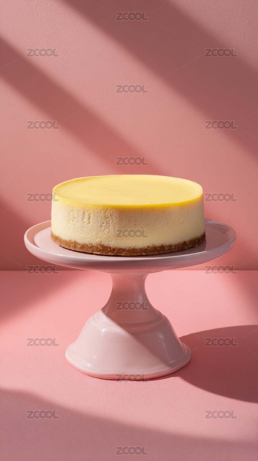 芝士蛋糕置于粉色背景的蛋糕架上