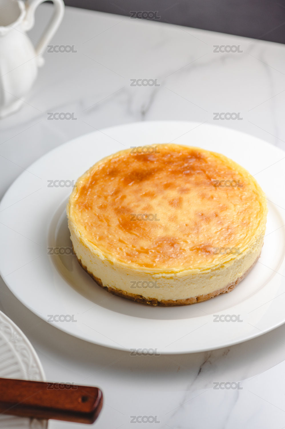 放在木盘上的一个完整的轻乳酪蛋糕