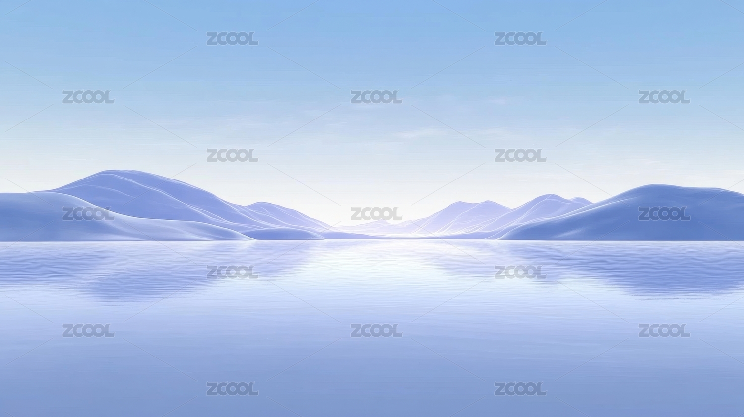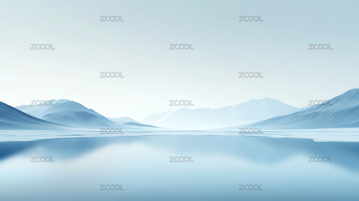 冰雪覆盖的宁静山谷,水面如镜倒映天空