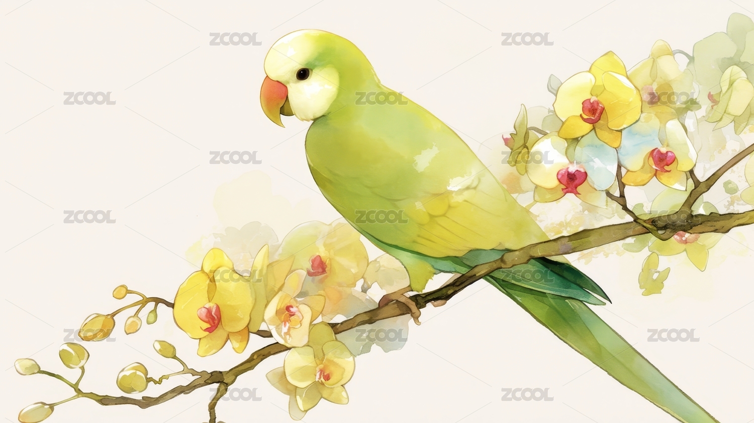 树林中站在枝丫上的彩色长尾巴鹦鹉插画绘画
