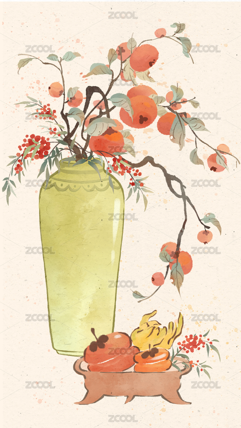 节气,秋天,国风,传统,插画,中国文化,季节,花瓶,树叶,红果