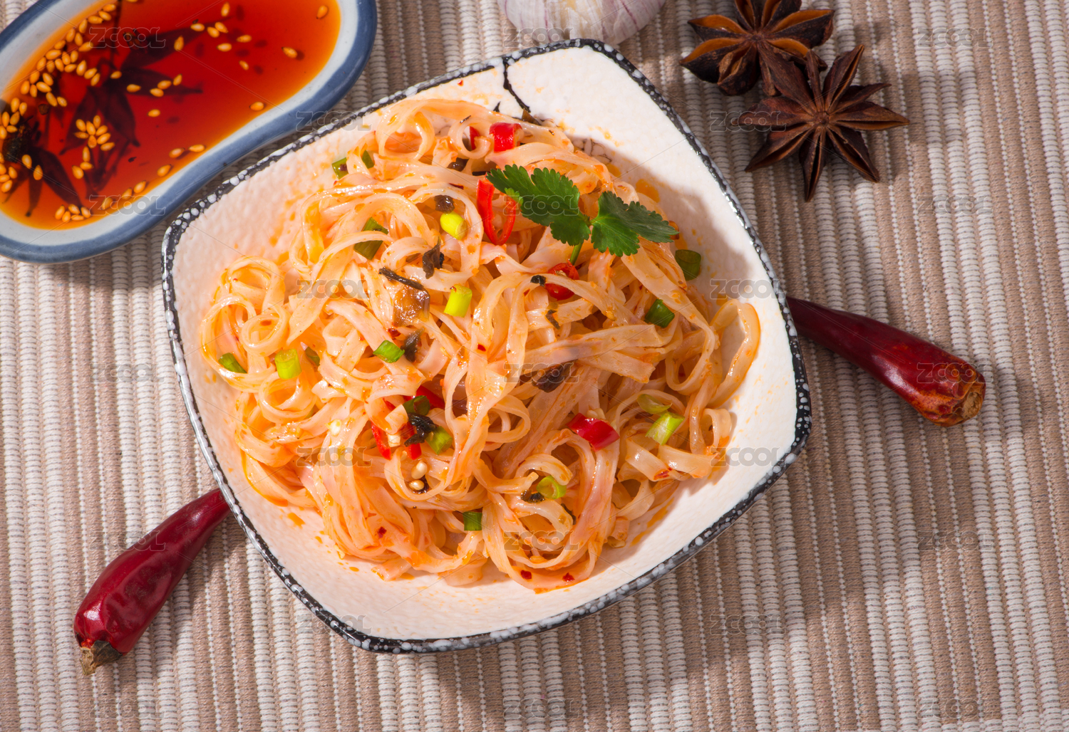木纹背景上盘子里有筷子夹起来的擀面皮凉皮