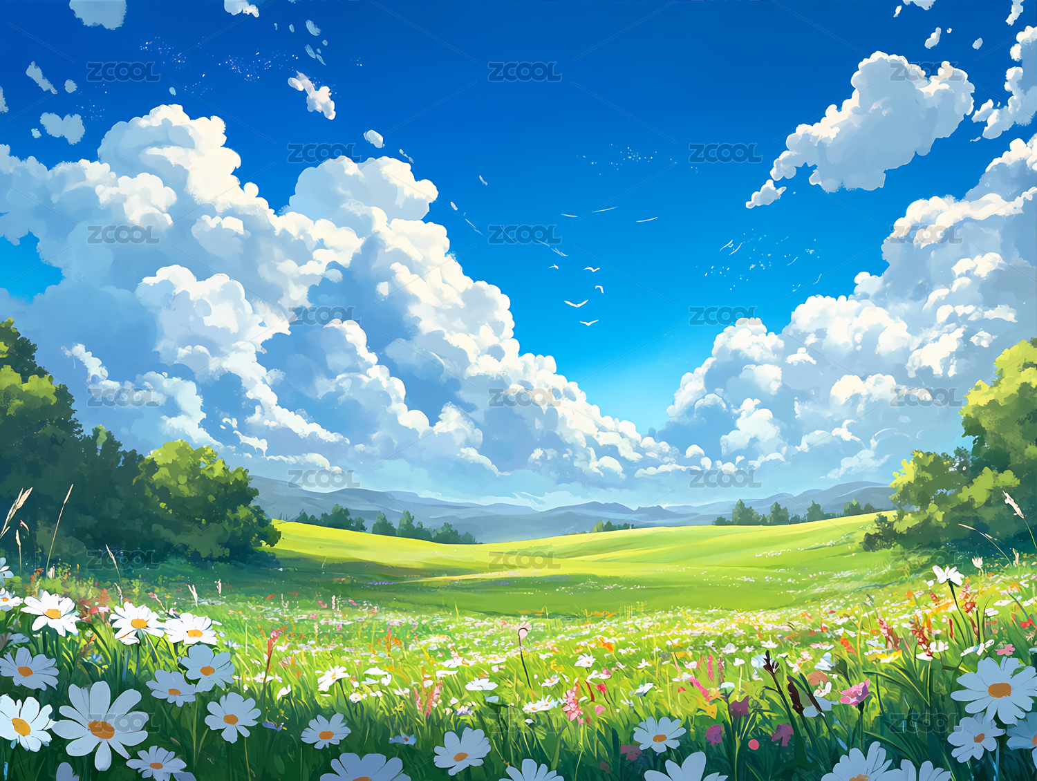 浪漫唯美晴朗的户外绿地风景插画