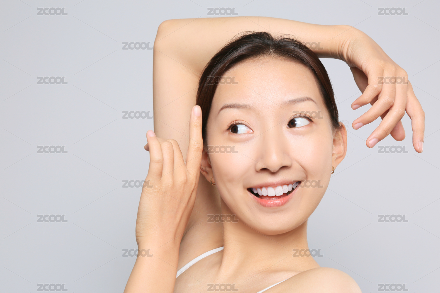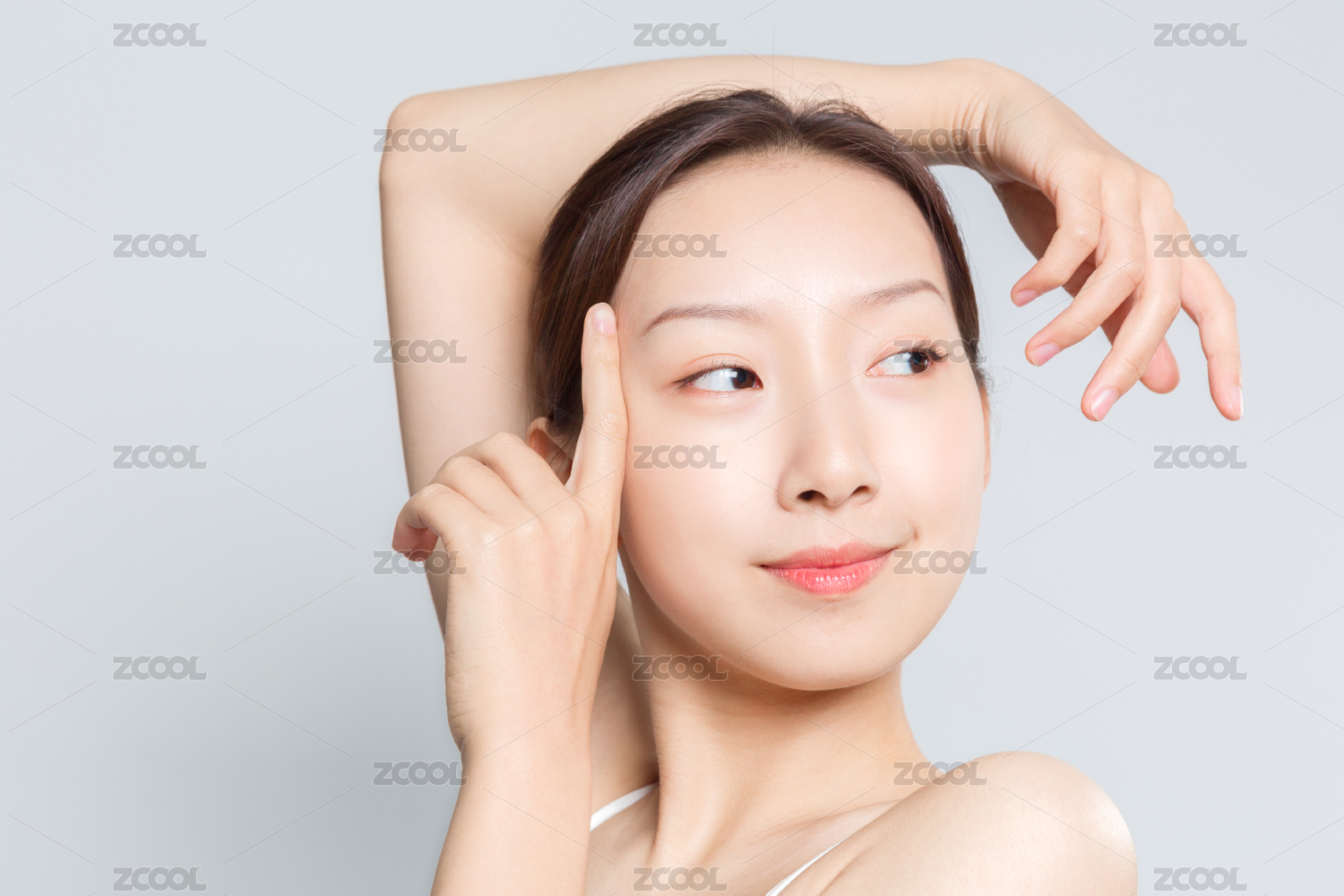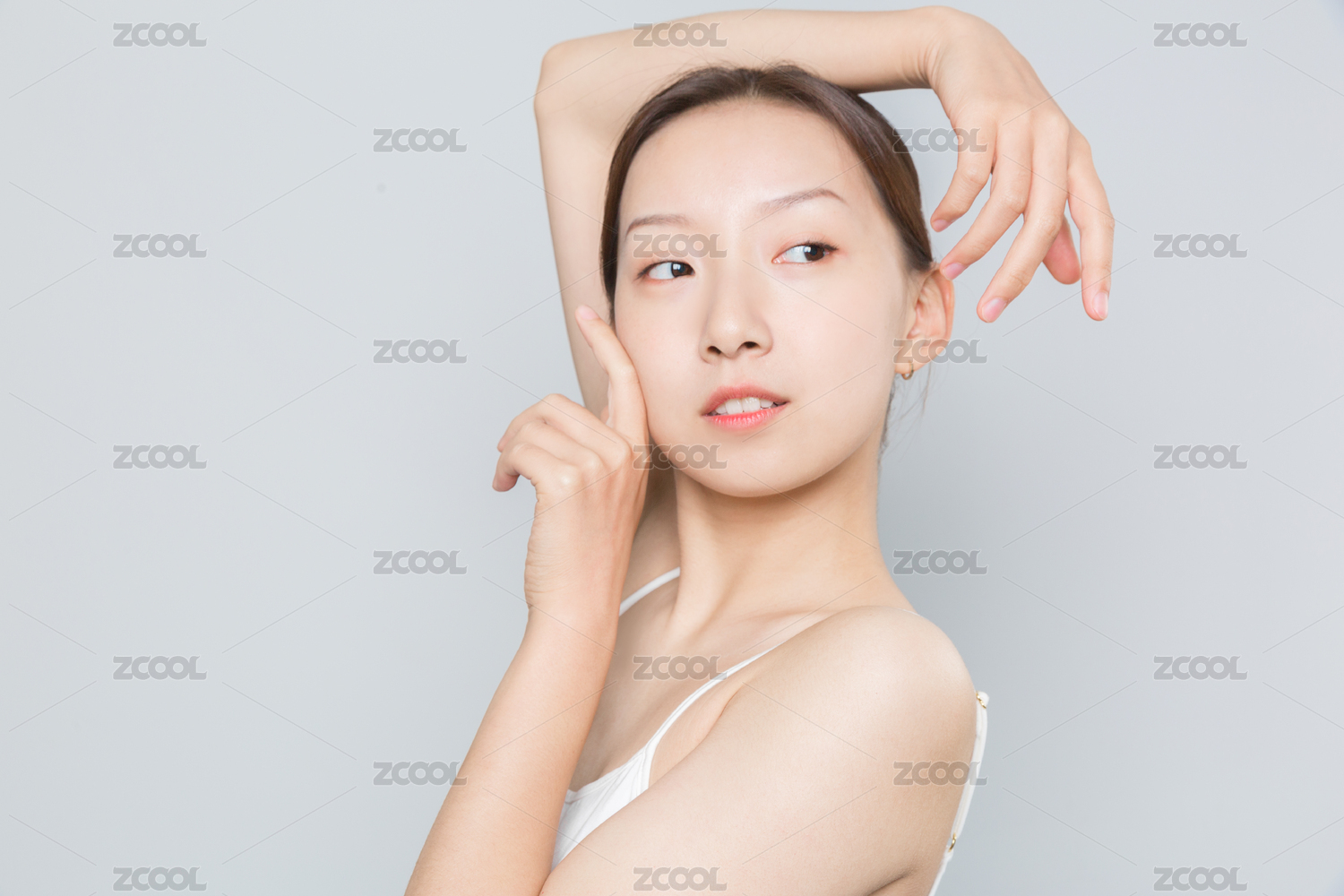 中国女性护肤美妆 双手环绕头部眼神看向别处