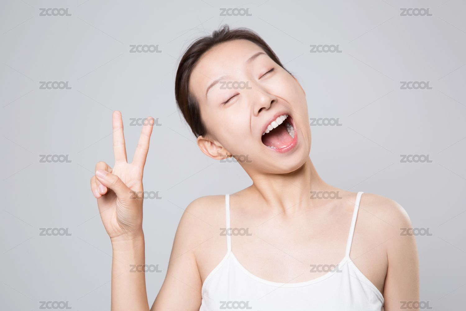 站在纯色背景前比出胜利手势的亚洲女孩开心大笑
