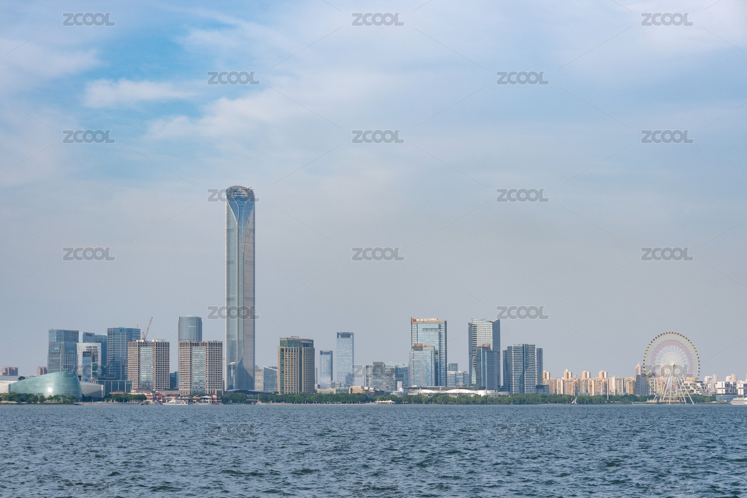 中国江苏苏州金鸡湖湖东现代滨水城市风光