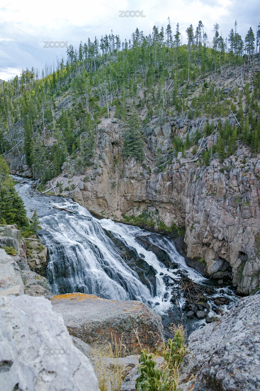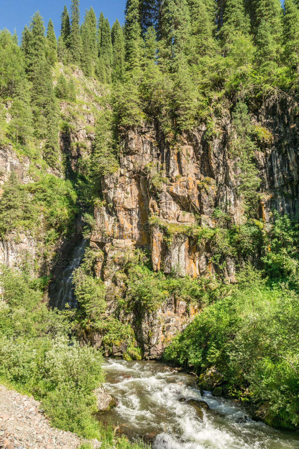 中国新疆可可托海大峡谷中的溪流与瀑布