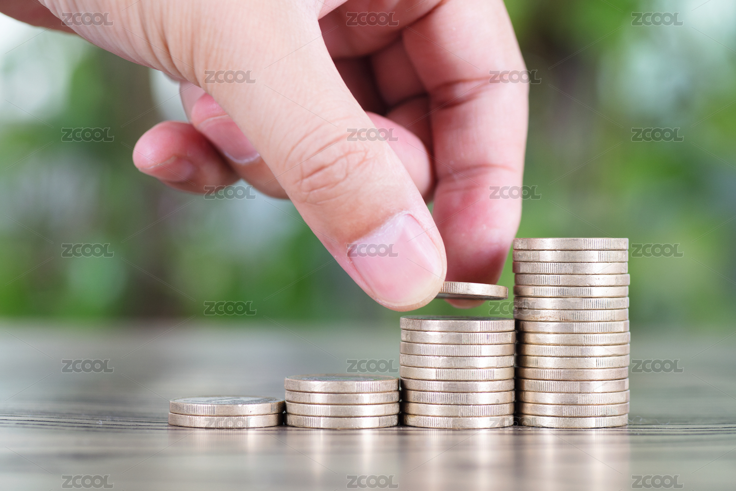 一东方女性的手从四撂高低不一的银色硬币中取走两枚