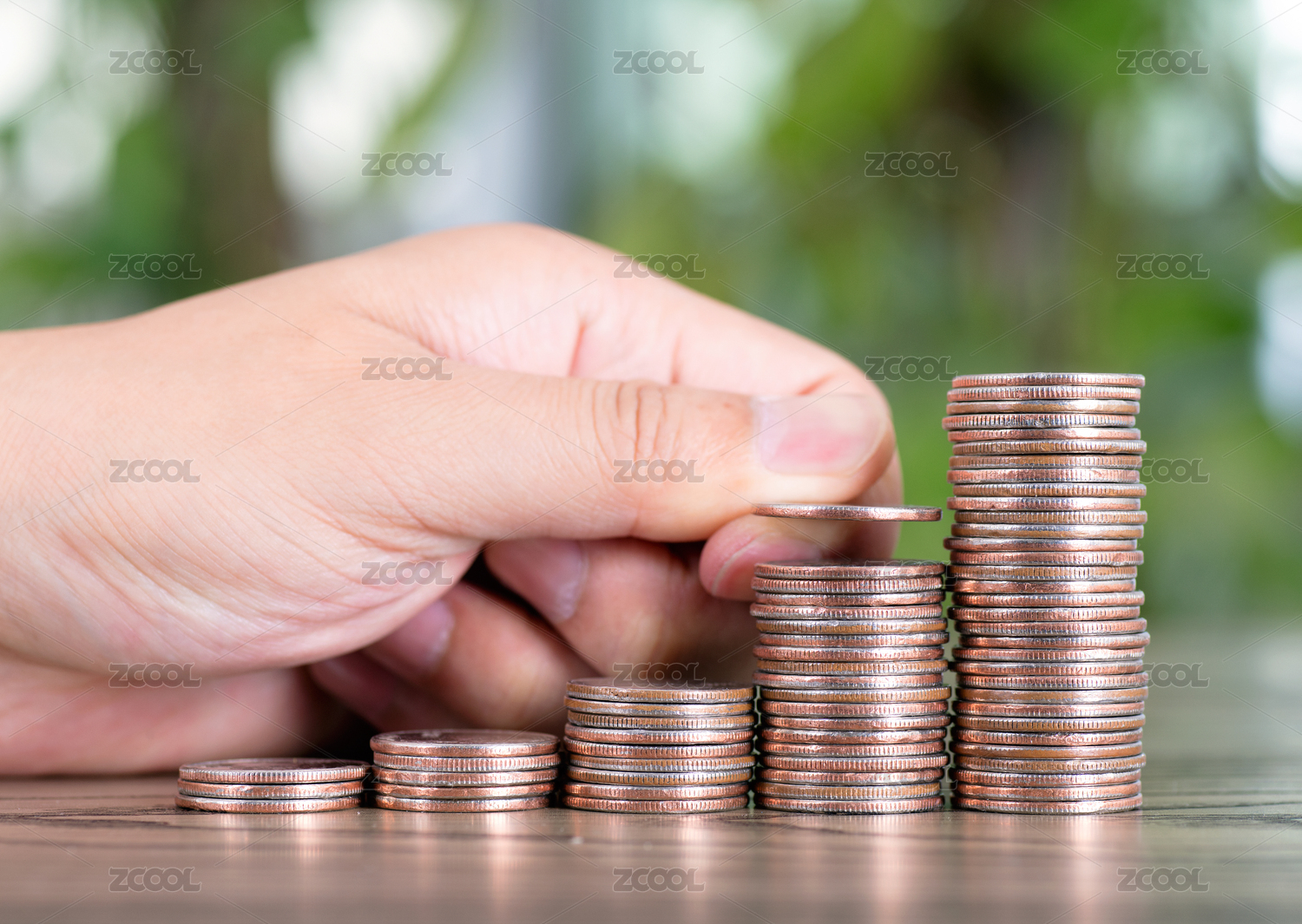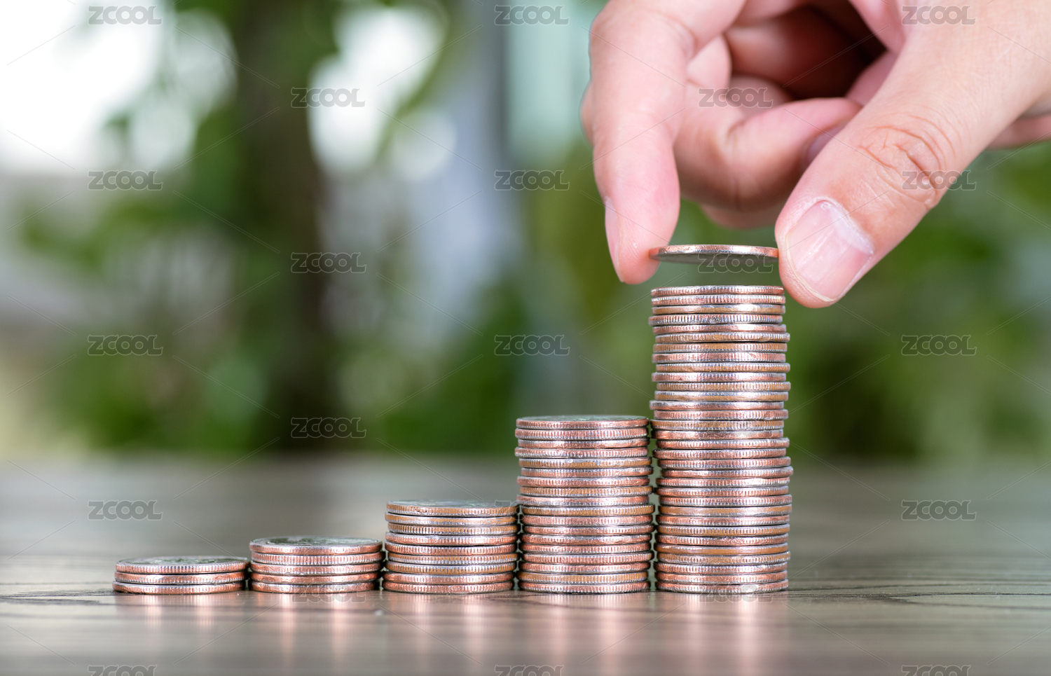 一排增长的美元硬币和一双继续加码的手