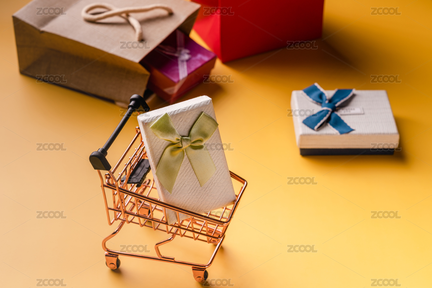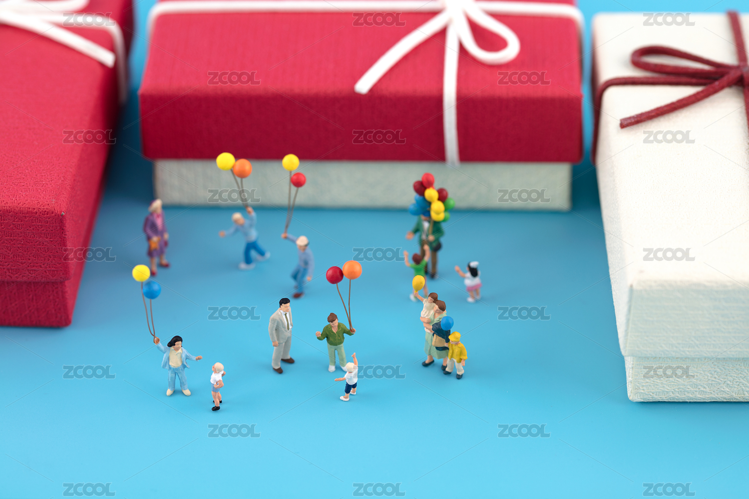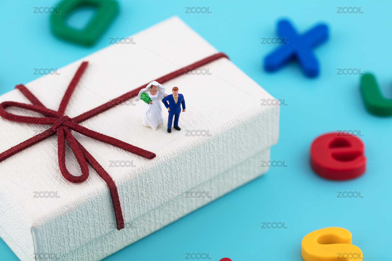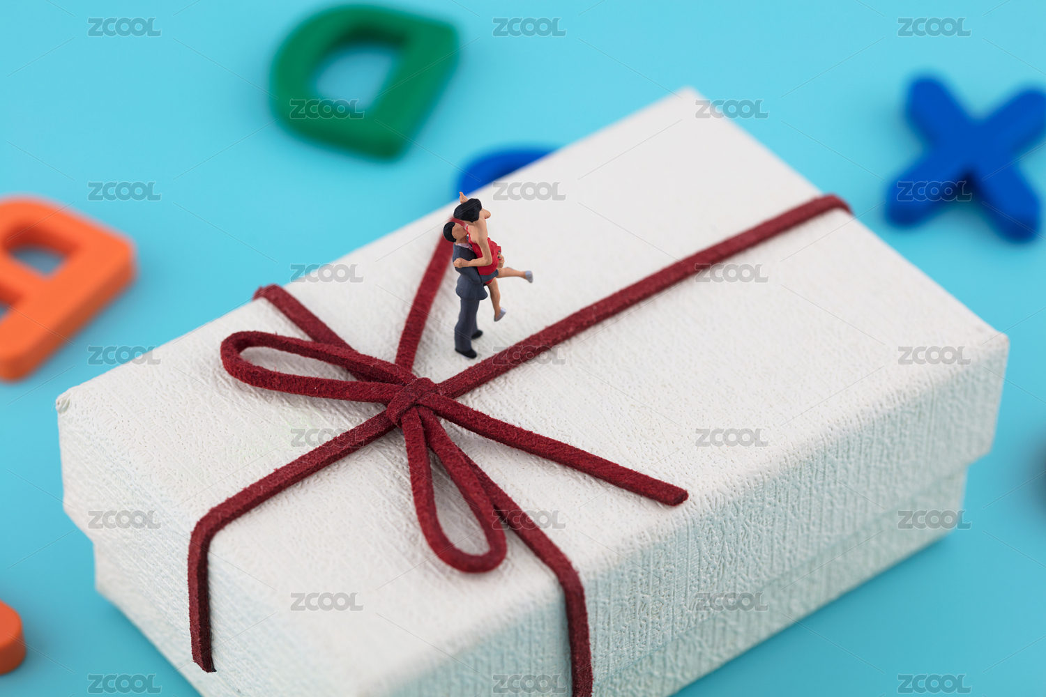 微缩创意站在蓝色礼物盒上用戒指求婚的男性