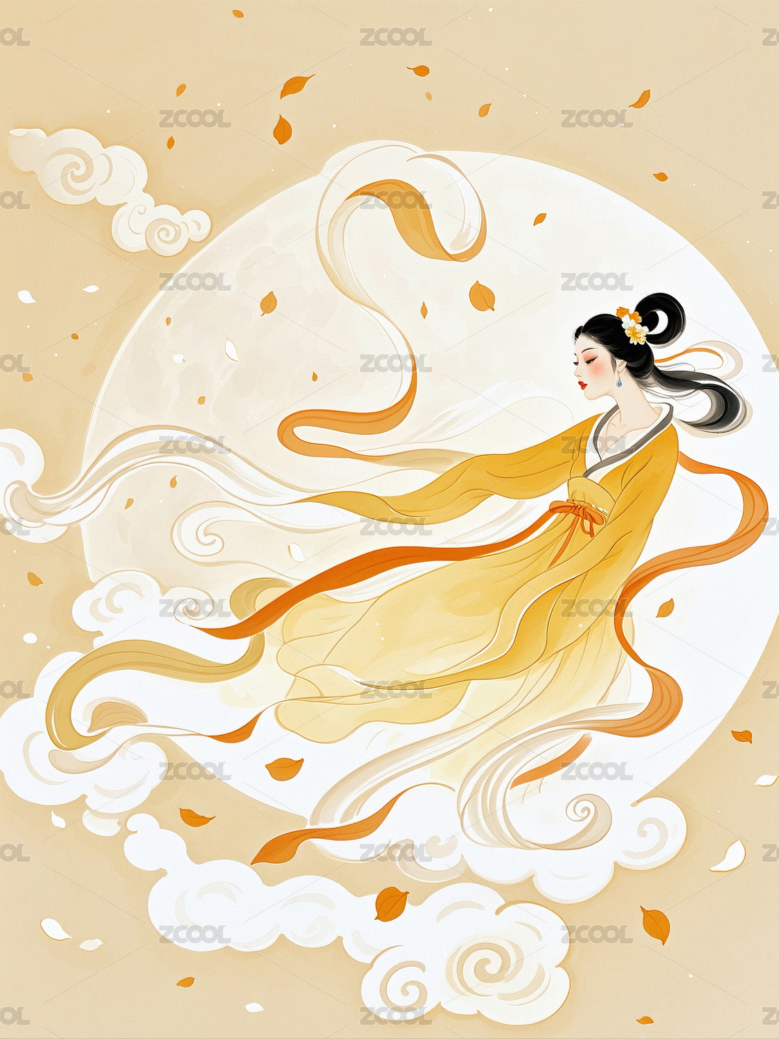 中秋节飞天仙女月亮天空祥云矢量插画竖构图