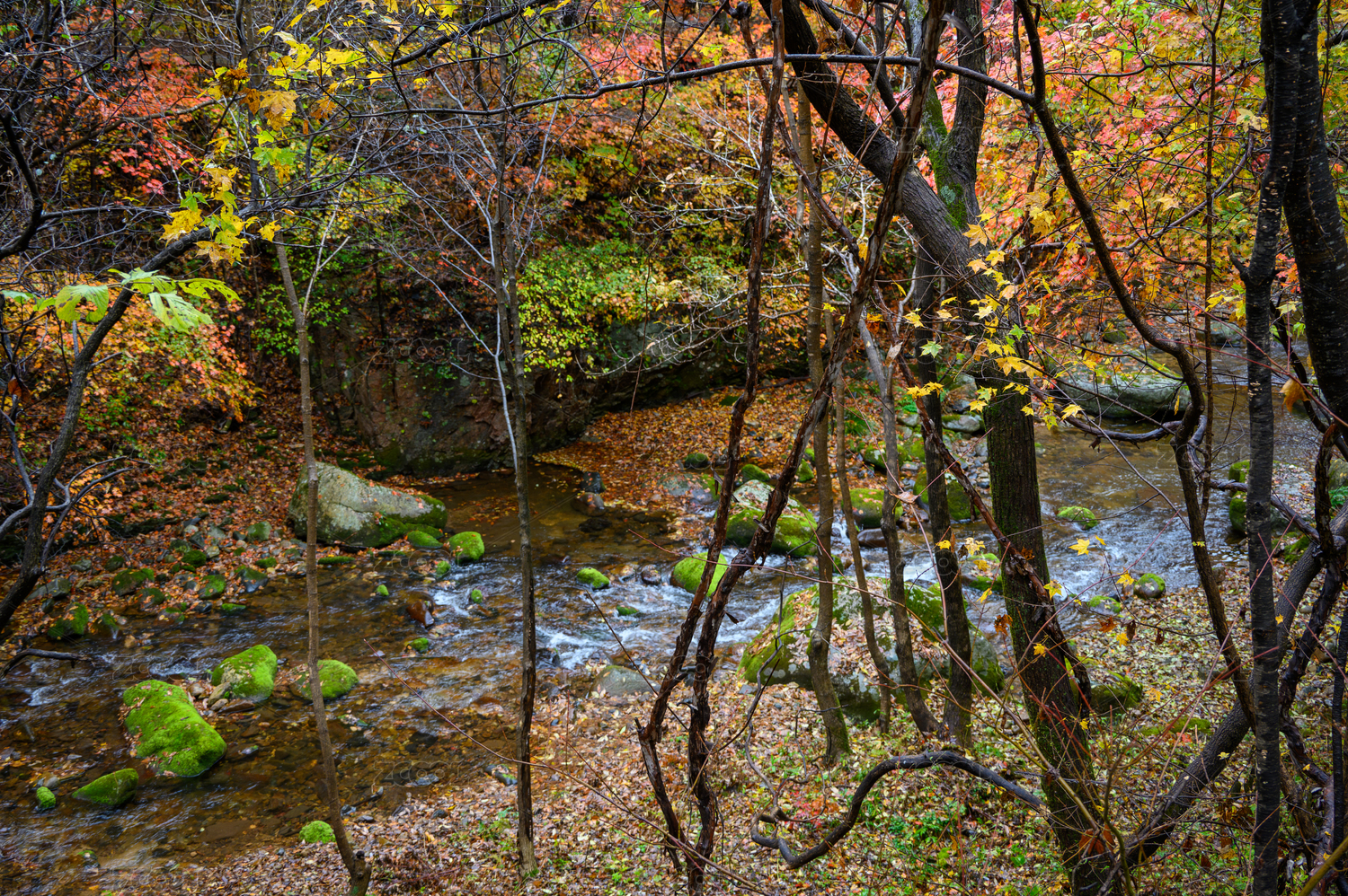 沈阳本溪老边沟,秋季枫树红叶溪流自然风光