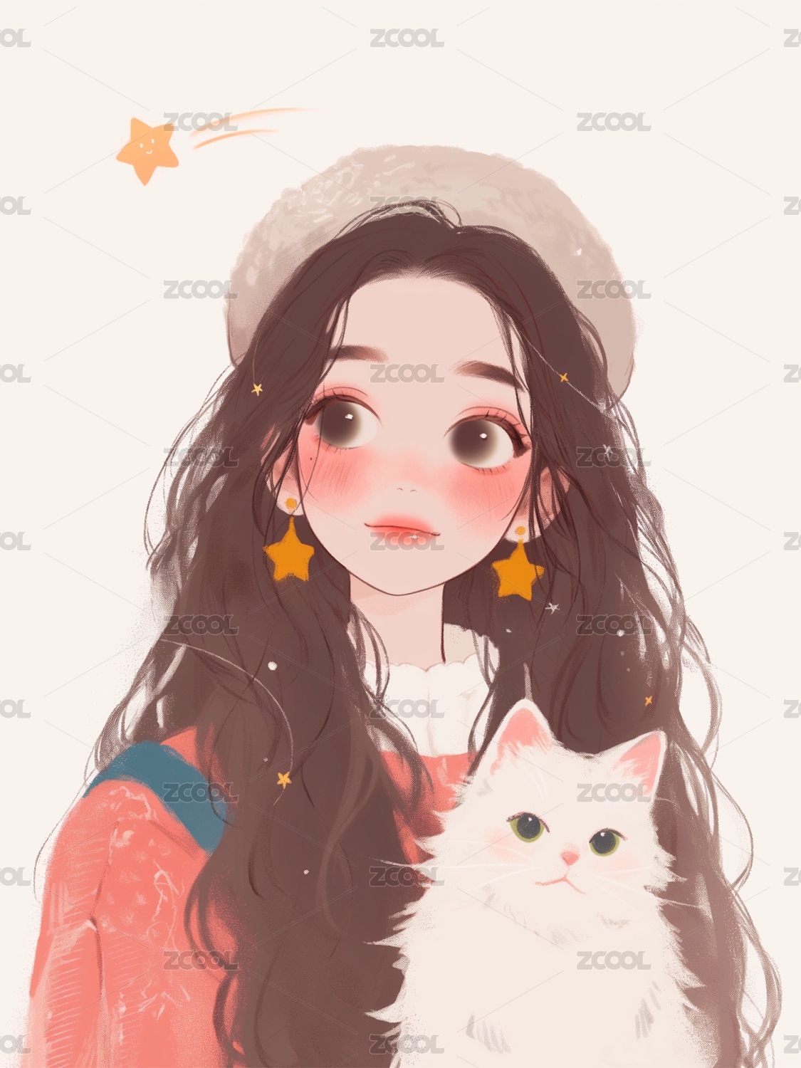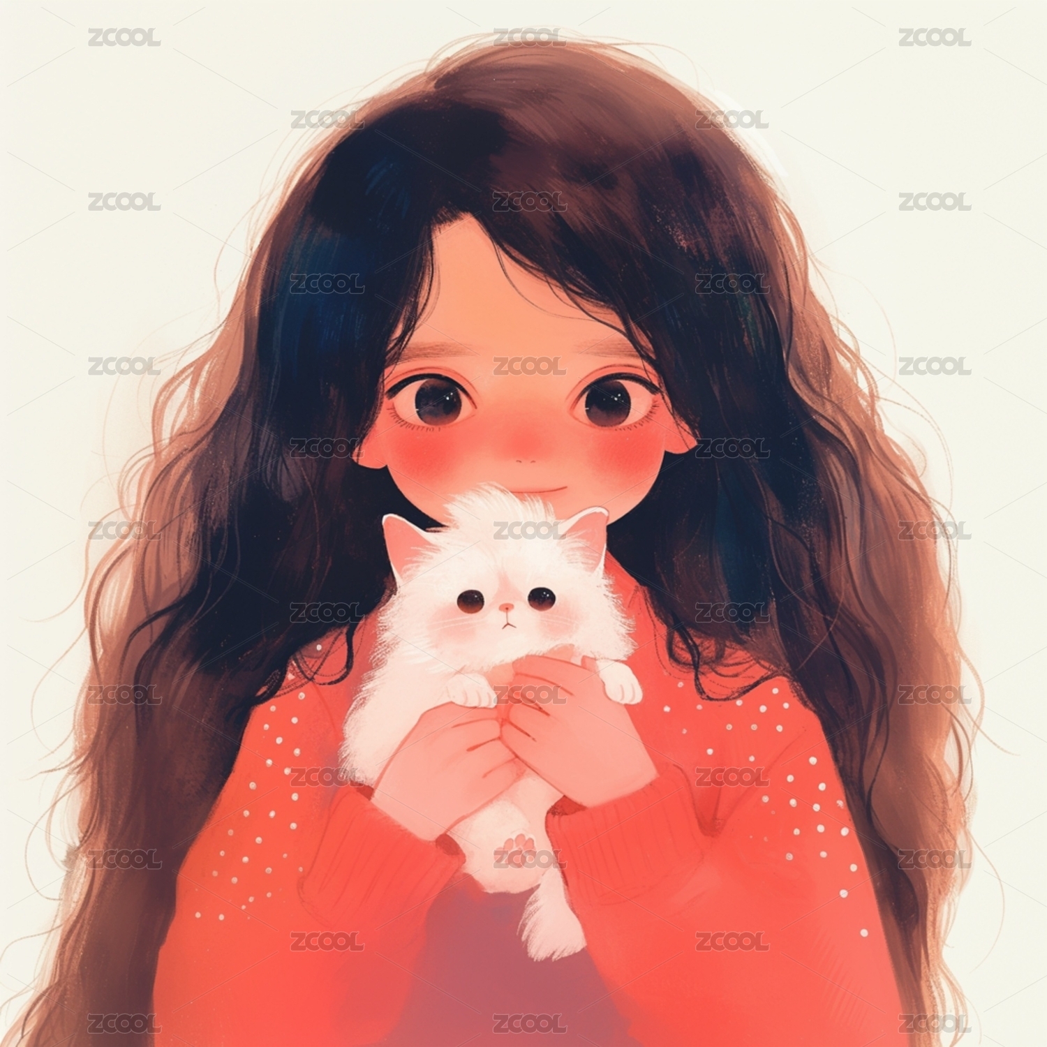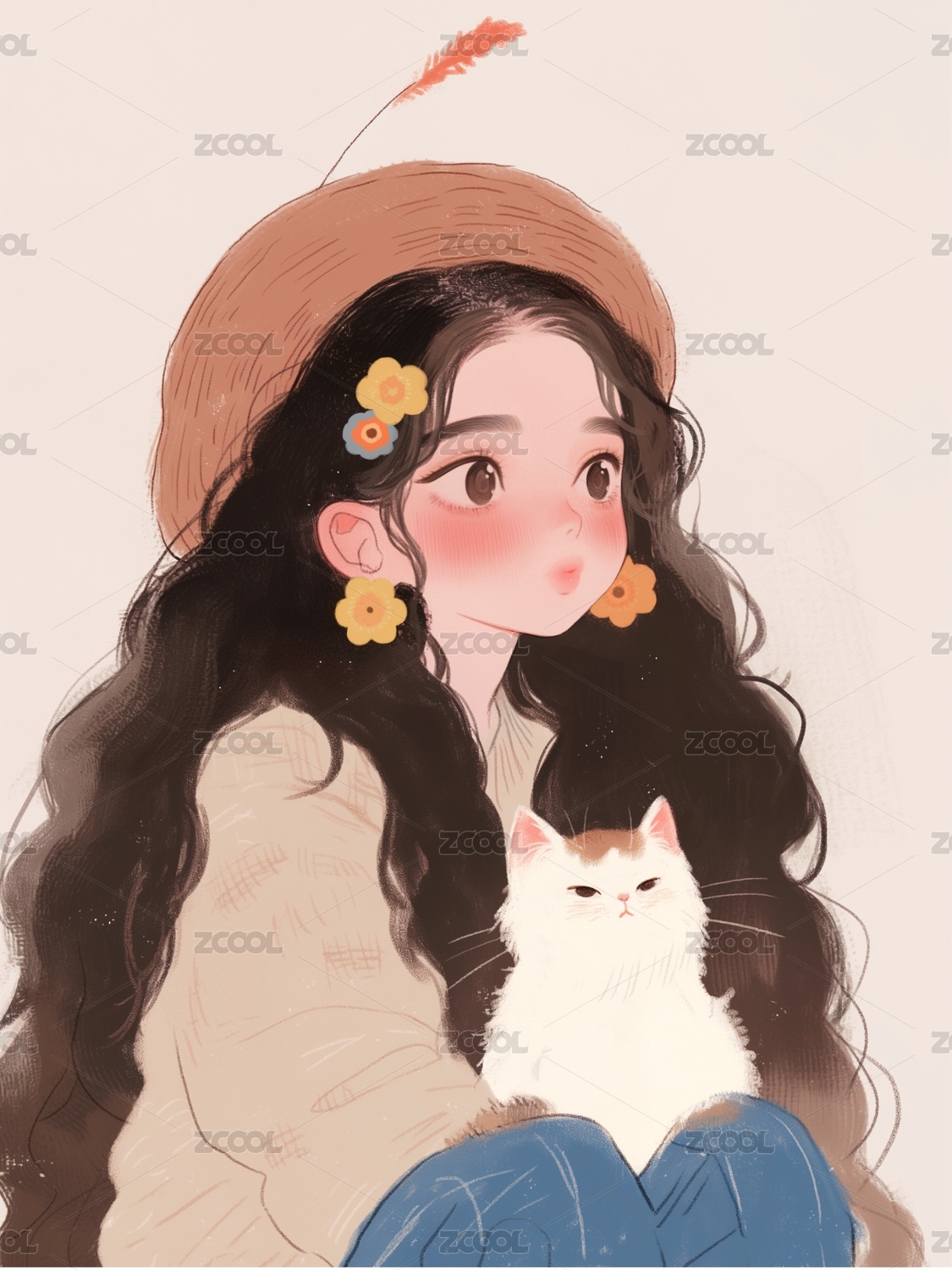 活泼可爱2d女孩猫咪平面插画唯美温柔