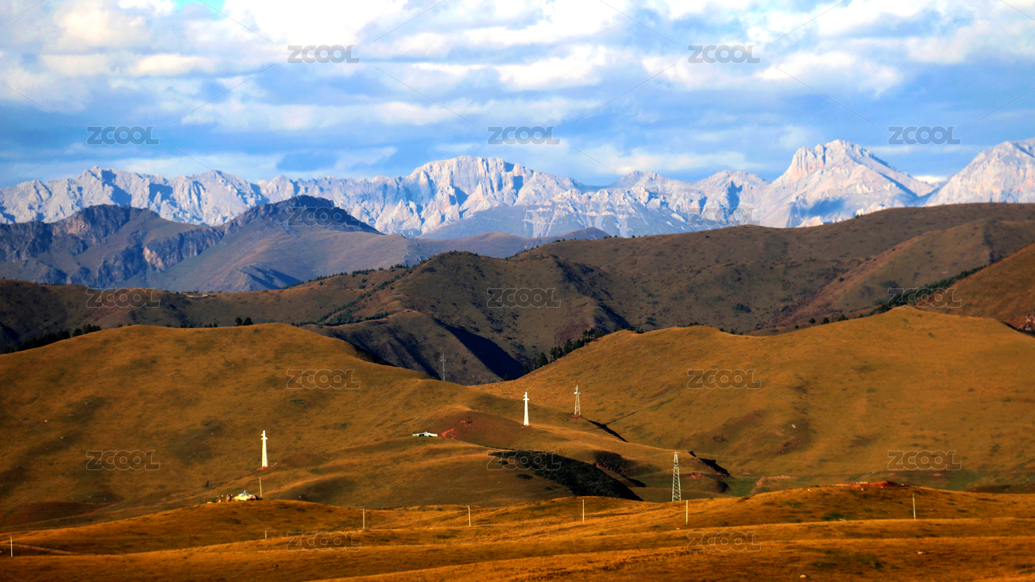中国新疆巴音布鲁克山坡上的输电塔与雪峰