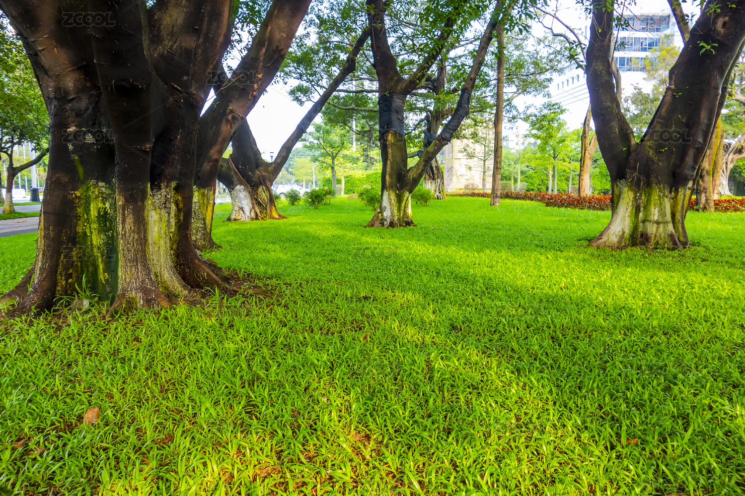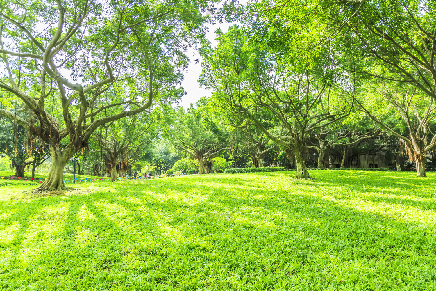 绿色的草地上种满了大榕树