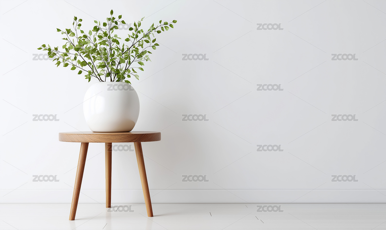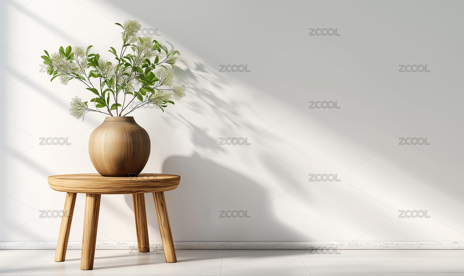 原木小桌白瓶绿植简约室内场景