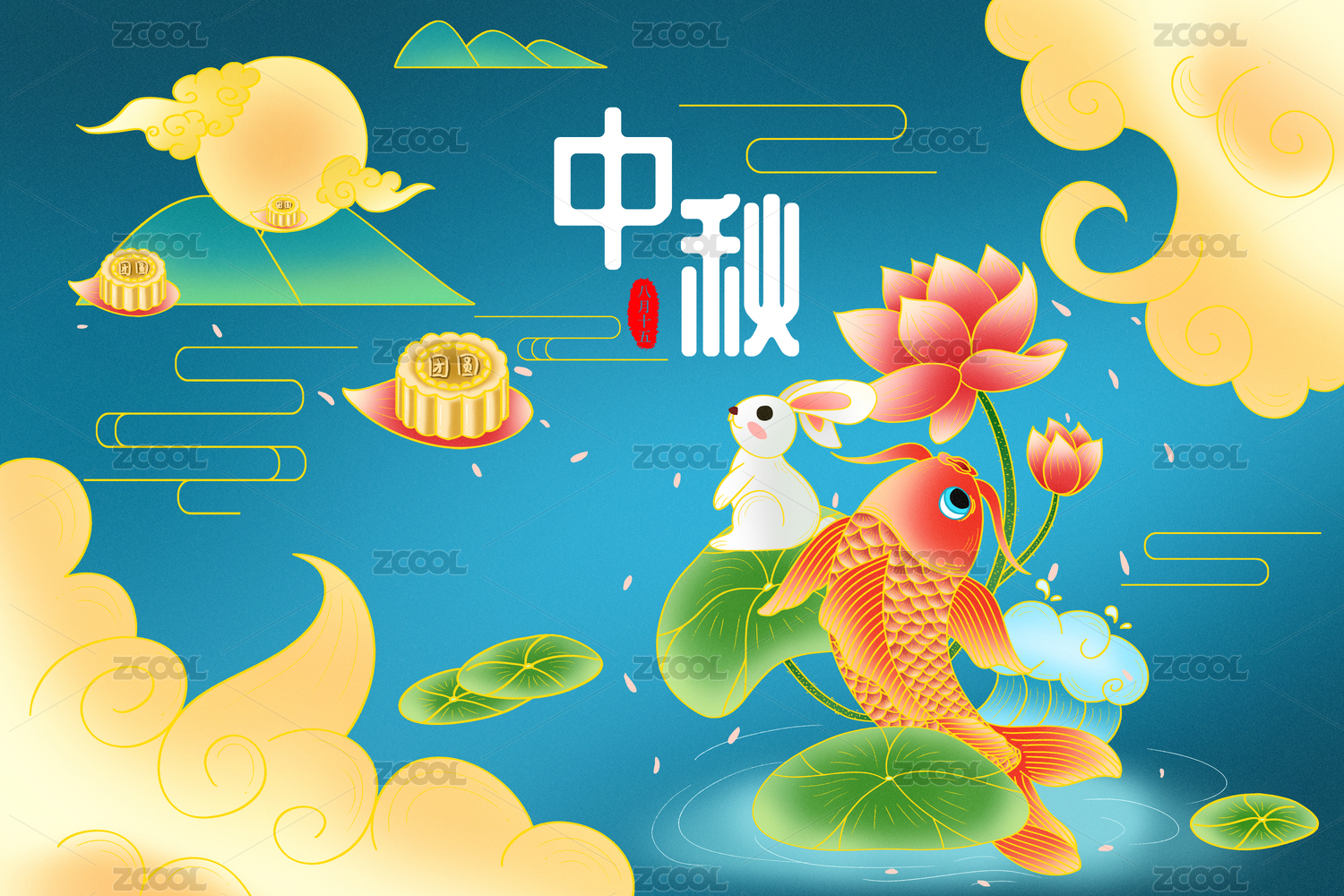 中秋节新中式剪纸风圆月白兔月饼竖版有字