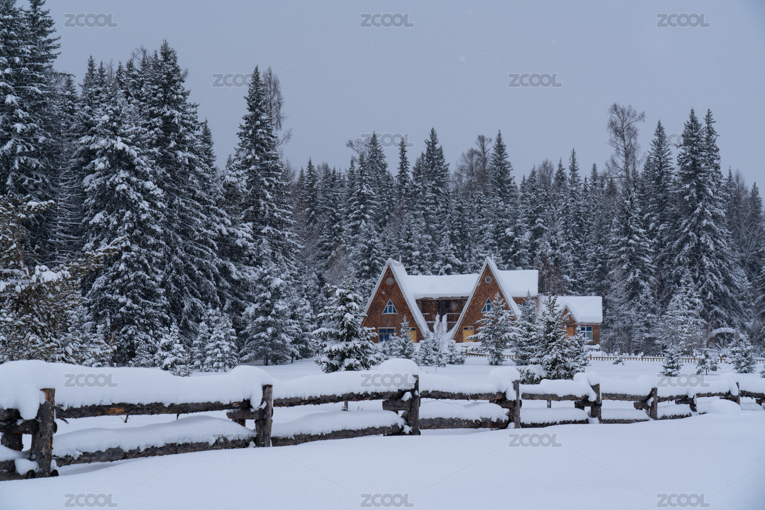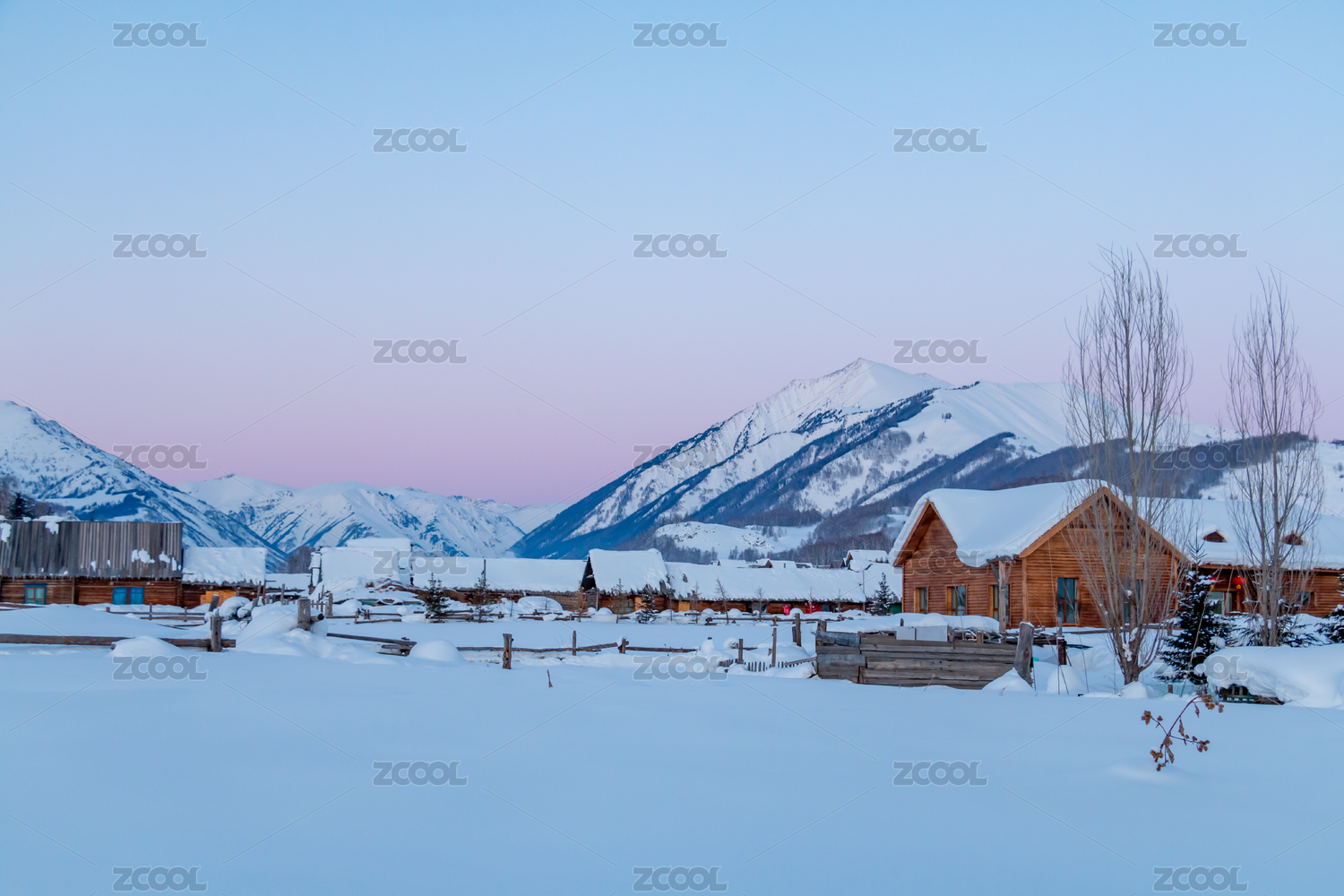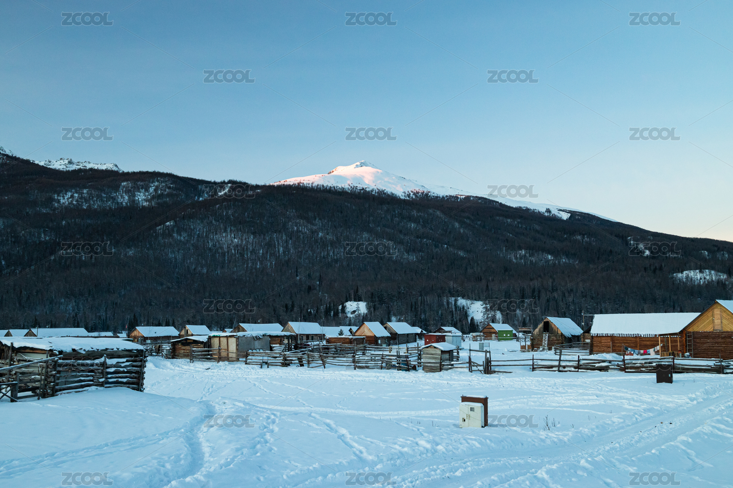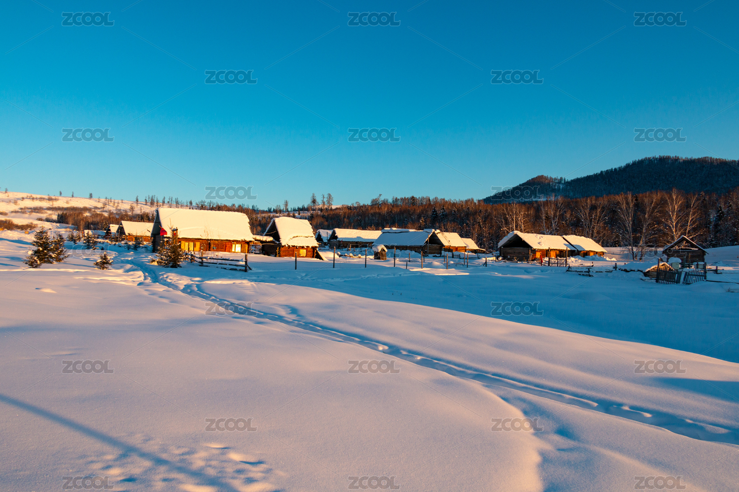 中国新疆冬季日出朝阳下的禾木村小木屋