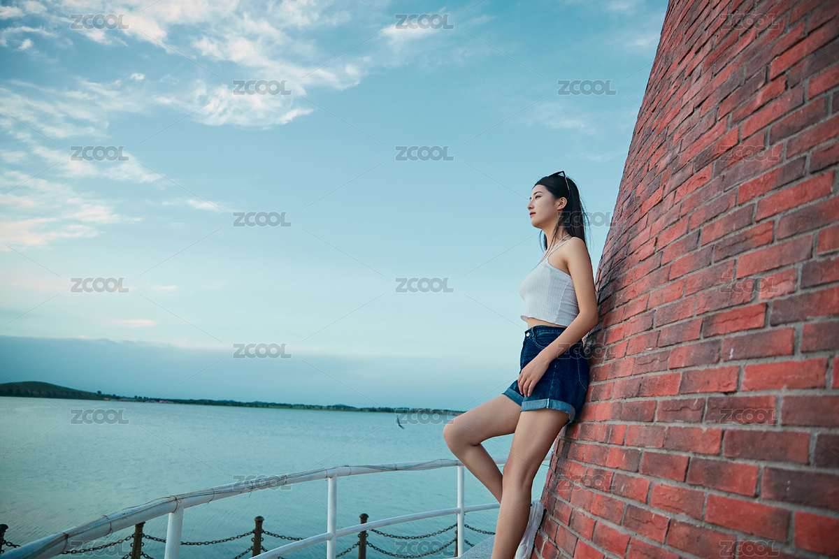 盛夏夕阳晚霞湖边码头看风景的少女