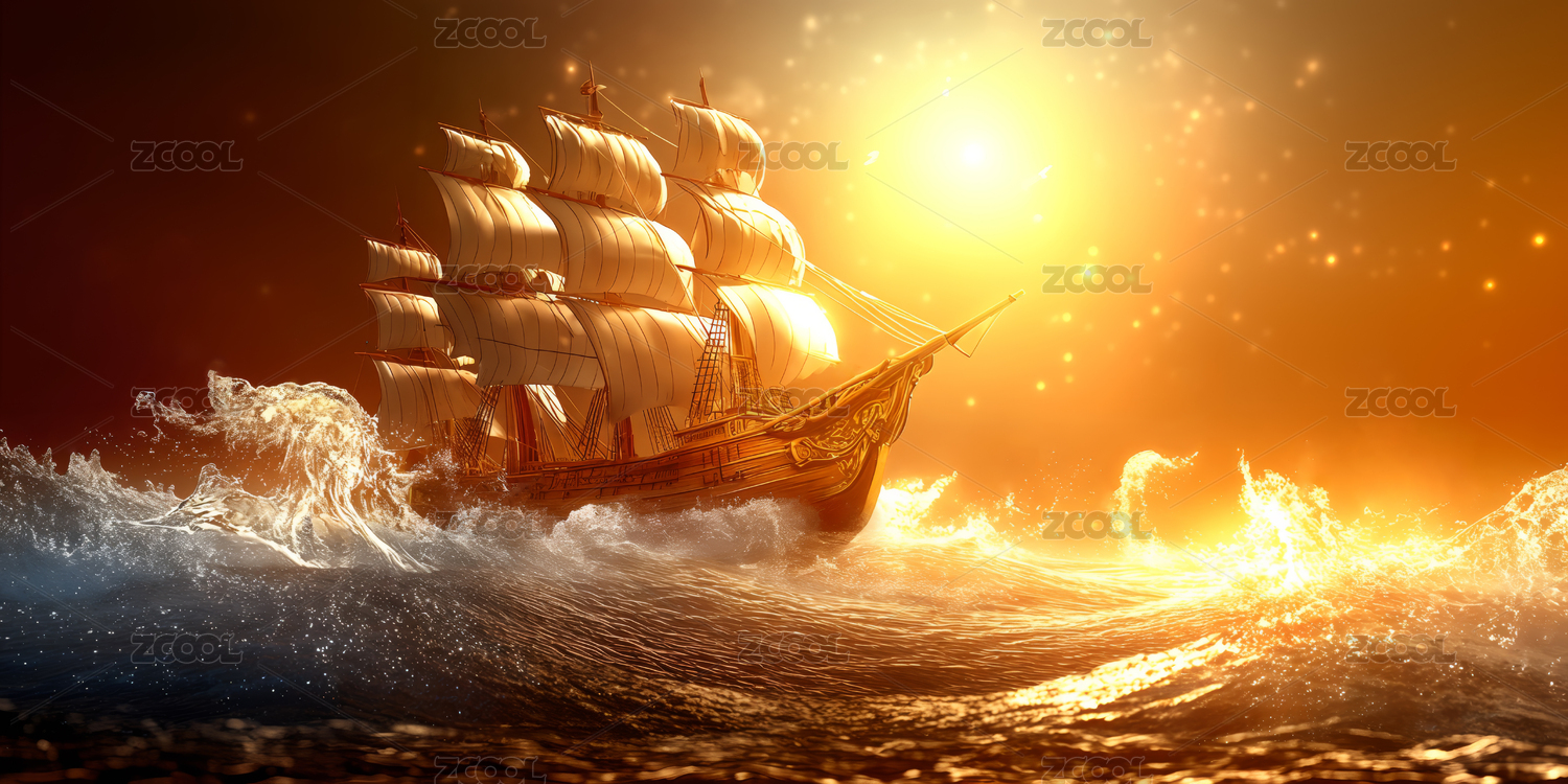 梦幻, 唯美, 帆船, 静谧, 宁静, 光芒, 未来, 日出, 海洋,金色