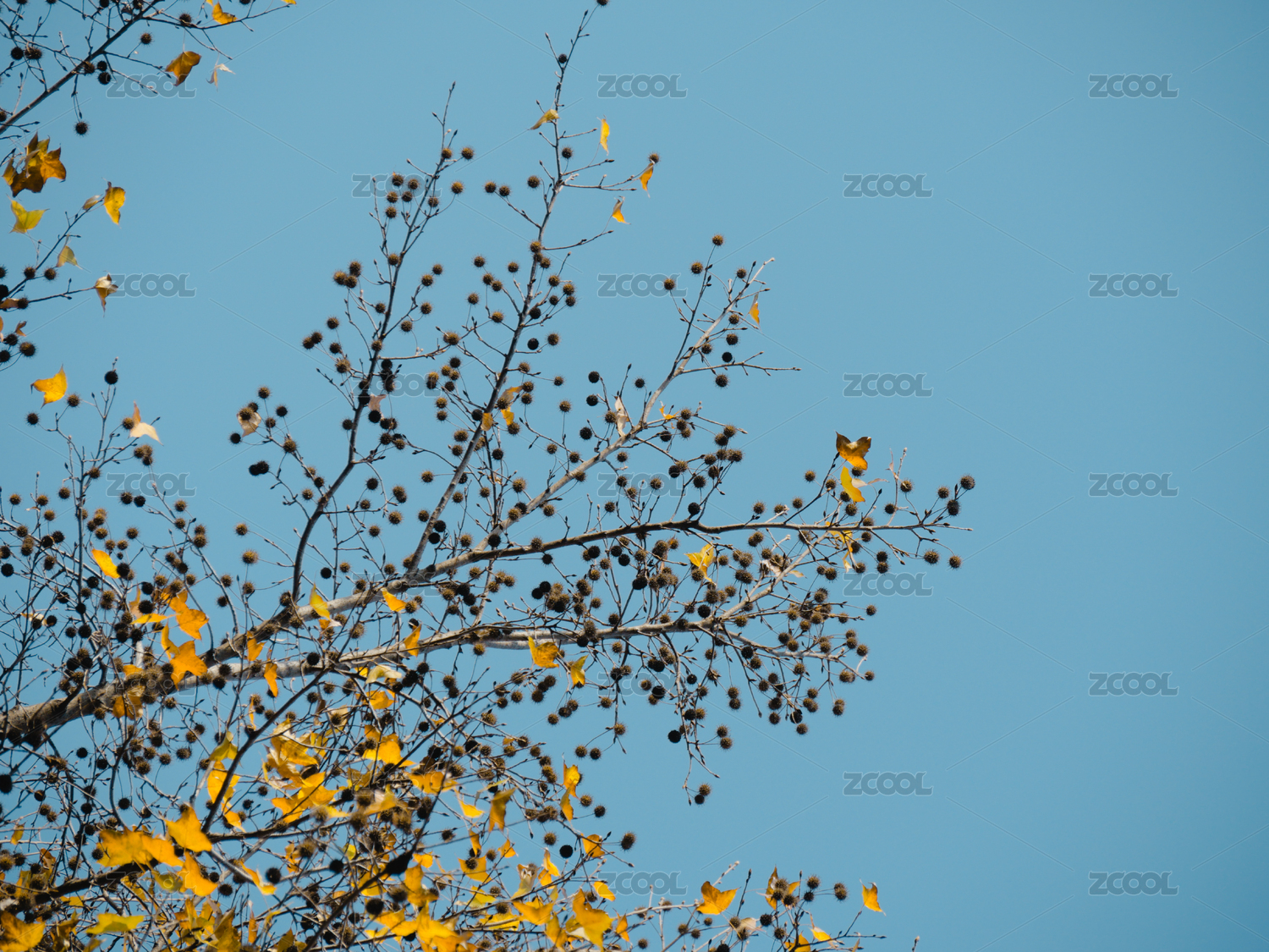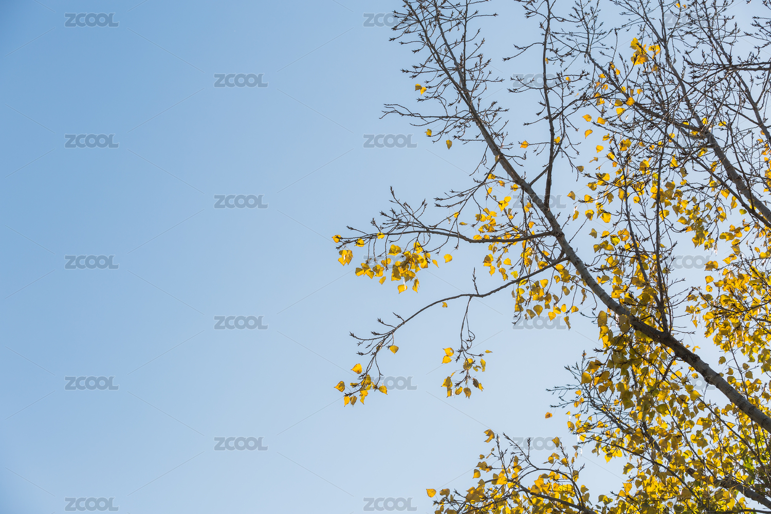 蓝色天空背景里变黄的树叶