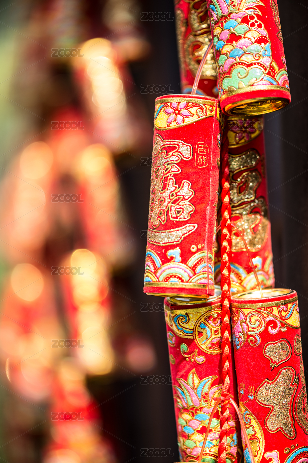 中国广州春节公园一角挂工艺品鞭炮装饰