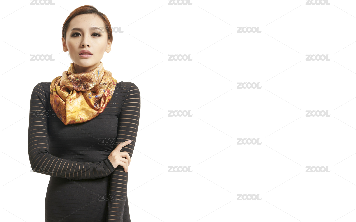 美丽的亚洲女孩披着黄色丝巾的白底图