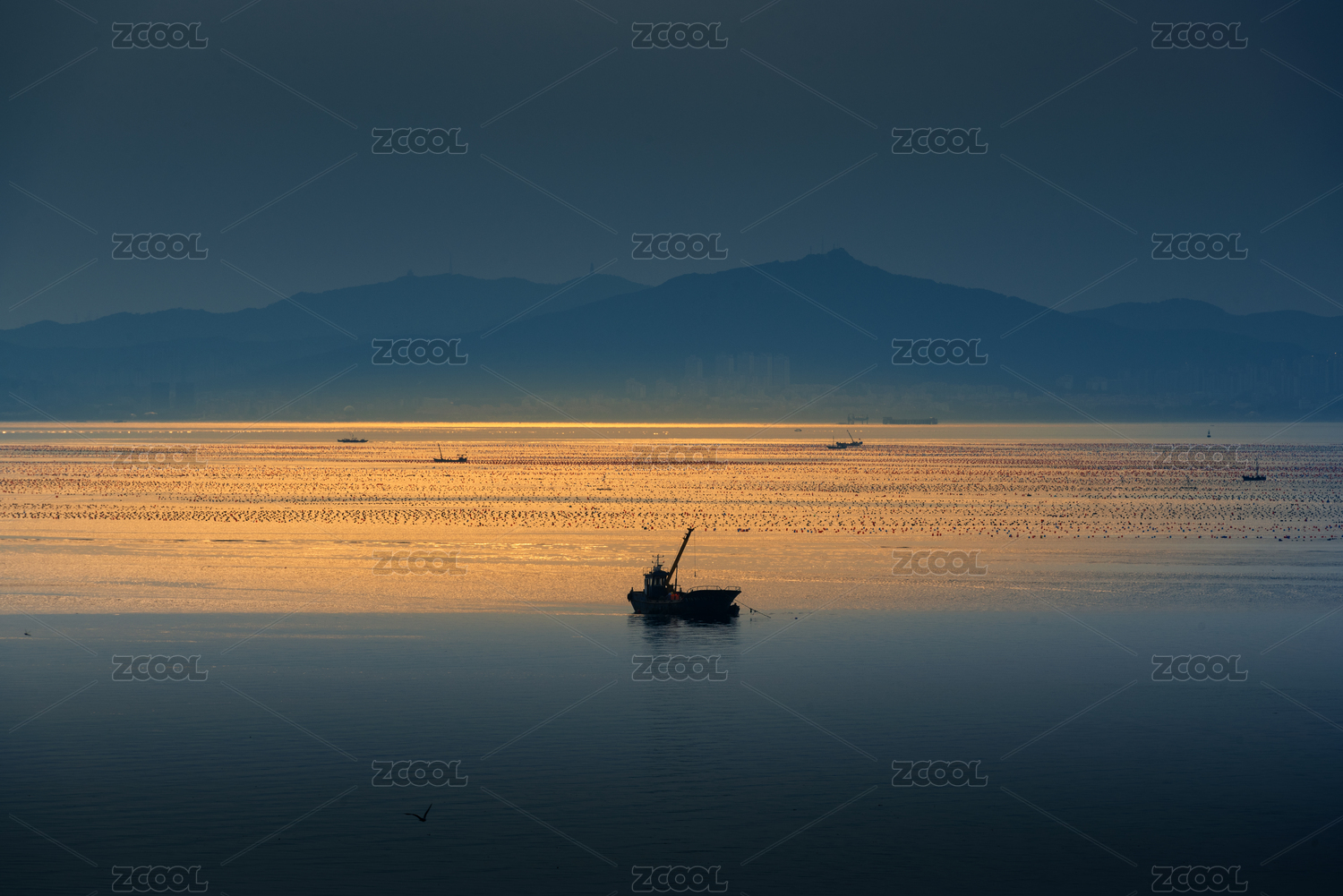 中国香港大埔大美督海湾港口渔船夕阳余晖