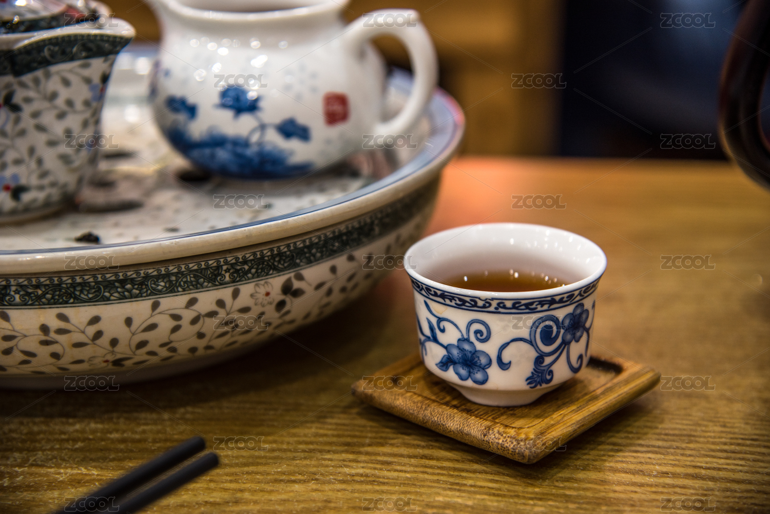 室内桌面上的传统印花陶瓷茶具茶碗特写