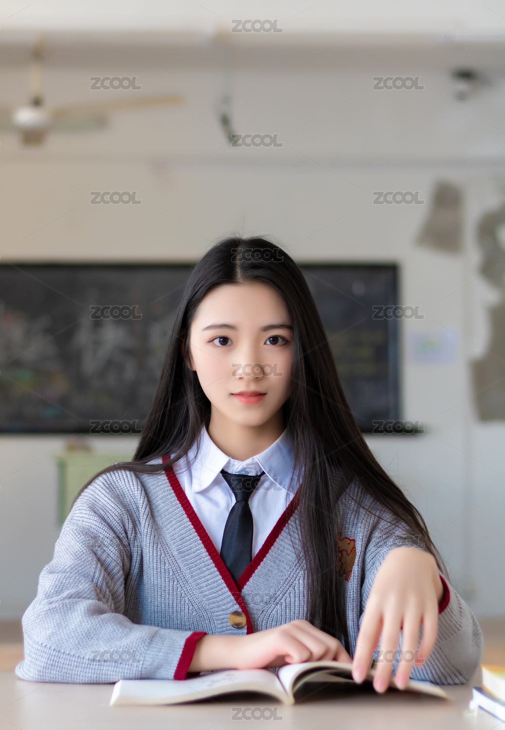 微笑的女生在教室翻书