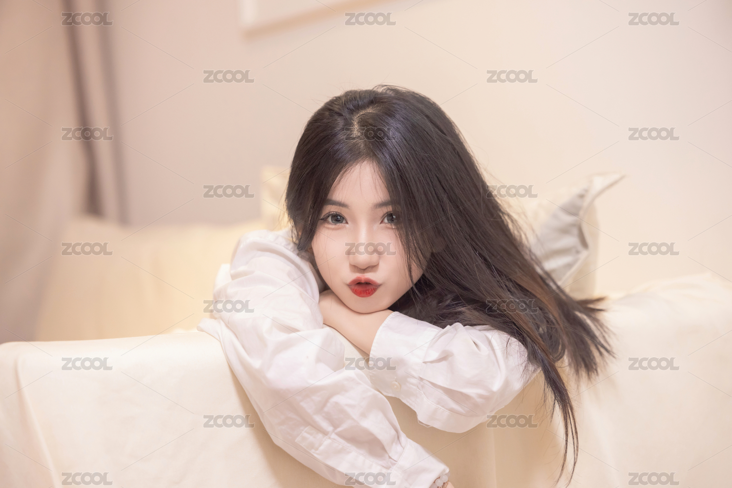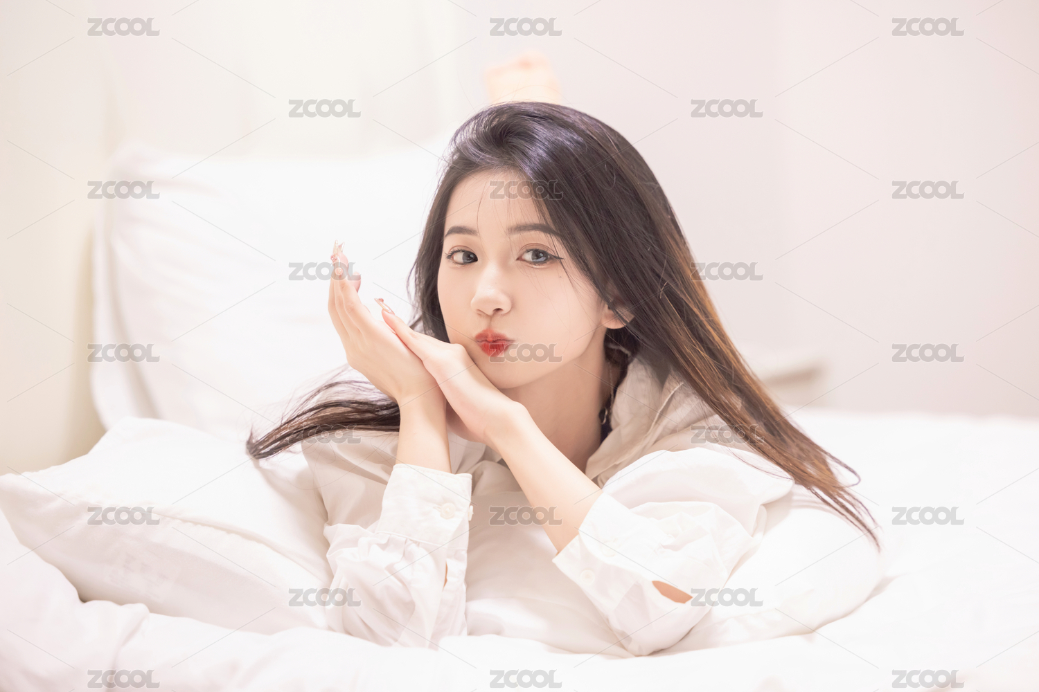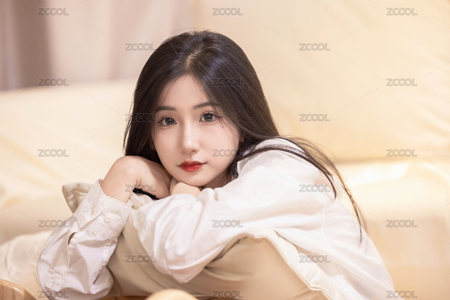正面特写拍摄一位美女抱着枕头躺在床上肖像
