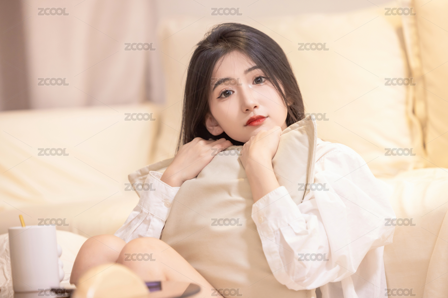 特写拍摄一名女性抱着枕头靠在茶几上