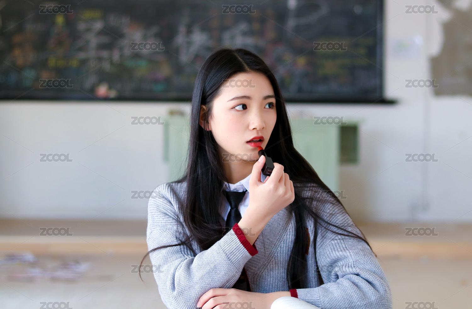 漂亮的女生坐在教室涂口红