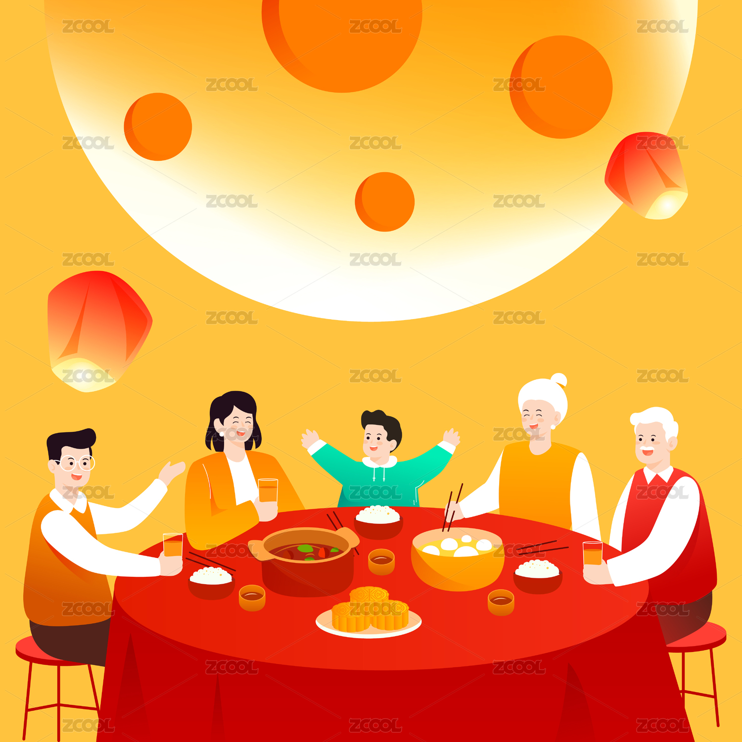 中秋节一家人团圆聚餐吃饭庆祝节日活动插画